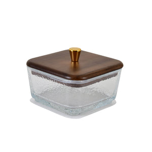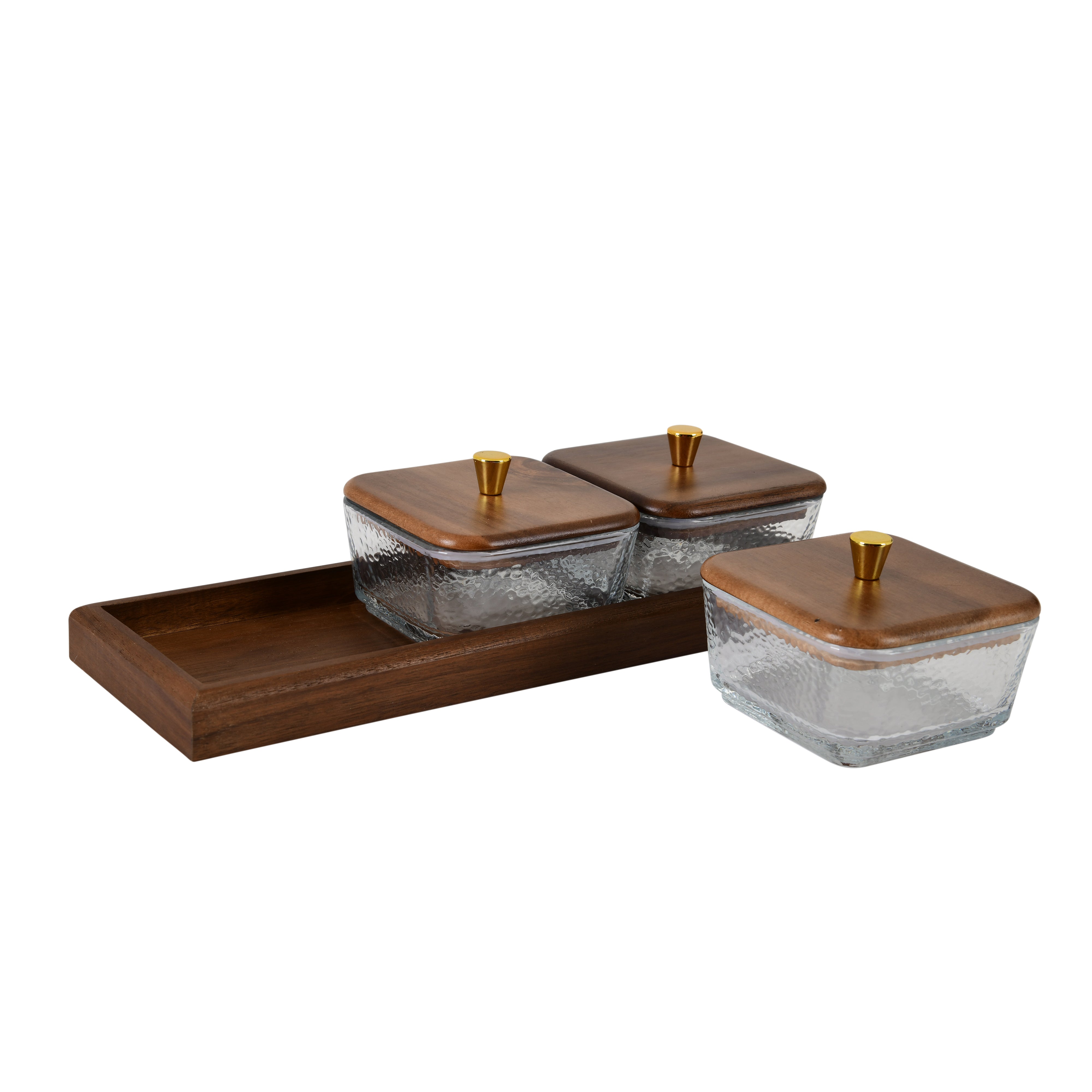 Design: This glass jar set combines clear, high-borosilicate glass containers with rich dark wooden lids, each topped with a golden knob handle that adds a luxurious touch. The jars rest securely on a smooth wooden tray, ensuring stability and organization. The transparent glass body allows you to easily view the contents, while the golden accents enhance its decorative appeal, making it a perfect addition to any modern kitchen or dining setup.