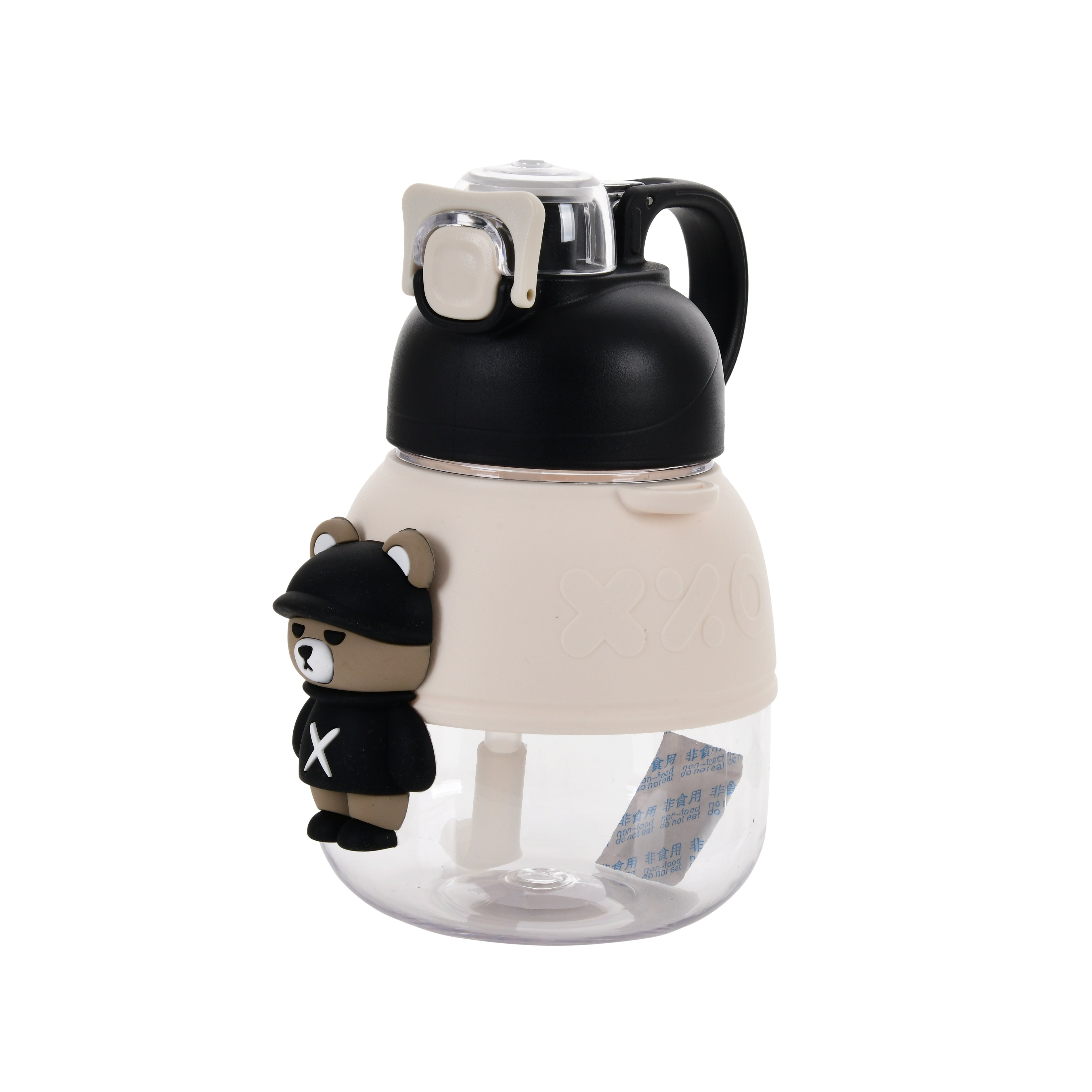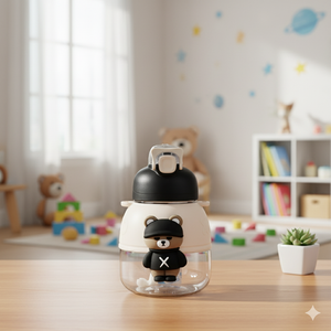 Keep your little one happily hydrated with this stylish Kids Bear Bottle. Styled in a chic black & white theme with a cute 3D bear figure, this bottle is designed to make drinking water fun and exciting for kids. It features a secure flip-top lid with a push-button lock for spill-free sipping and a wide mouth for easy refilling and cleaning. The lightweight body paired with an adjustable carry strap makes it perfect for school, picnics, or travel.