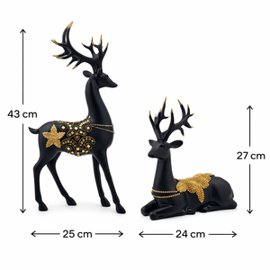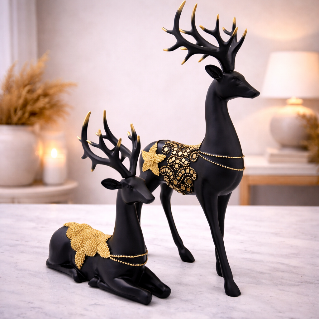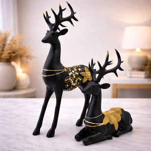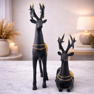 This black and gold deer showpiece set of 2 is a premium decorative décor piece that adds elegance, luxury, and warmth to any space. Made from high-quality polyresin, the set features two beautifully designed deer figurines – one standing and one resting. The matte black finish combined with rich gold detailing on the body, antlers, and necklace accents gives the set a royal and modern look. The deer symbolises grace, peace, prosperity, and positivity, making this set a meaningful addition to home décor. The contrasting poses create a balanced and eye-catching display when placed together. These showpieces are perfect for coffee tables, console tables, shelves, living room corners, or festive décor setups. They also make an excellent gifting choice for housewarming, weddings, anniversaries, Diwali, Christmas, or corporate gifting.