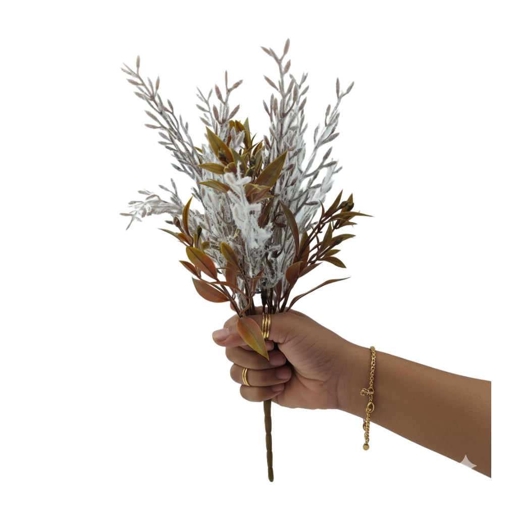 Artificial Filler Stick – Brown-Green Leaves with White Frosted Sprigs