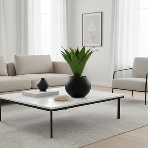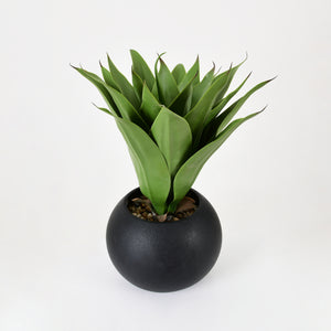 This piece is styled after natural agave and aloe rosettes, with broad, curved leaves radiating from the center for a realistic, layered look. The foliage has subtle grain detailing and a gentle satin sheen, giving it an authentic, lifelike finish even up close. Arranged at varying angles and heights, the leaves create depth and natural shadow play. The low, wide bowl-shaped planter features a finely textured matte black surface that resists fingerprints and provides visual balance to the vibrant green leaves. A top layer of multi-toned decorative pebbles adds authenticity and stability. Its compact height makes it perfect for tabletops, shelves, and reception areas where tall planters might obstruct visibility.
