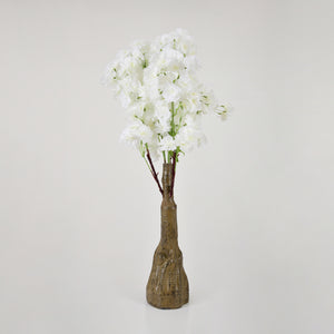 The plant is styled with a realistic brown trunk sculpted with bark-like grooves and natural wood texture. From the trunk, several branches rise upward, each carrying layered white blossoms with soft, crinkled petals and subtle folds for lifelike depth. Gentle yellow centers add dimension, while natural green foliage interspersed among the flowers enhances realism and contrast. The arrangement spreads upward and outward in a full bouquet effect, ensuring a balanced and natural look from every angle. The sturdy trunk base ensures stability, while the vertical design makes it ideal for corners, entryways, or as a centerpiece. Unlike real plants, it never wilts—maintaining a spring-fresh look all year round.