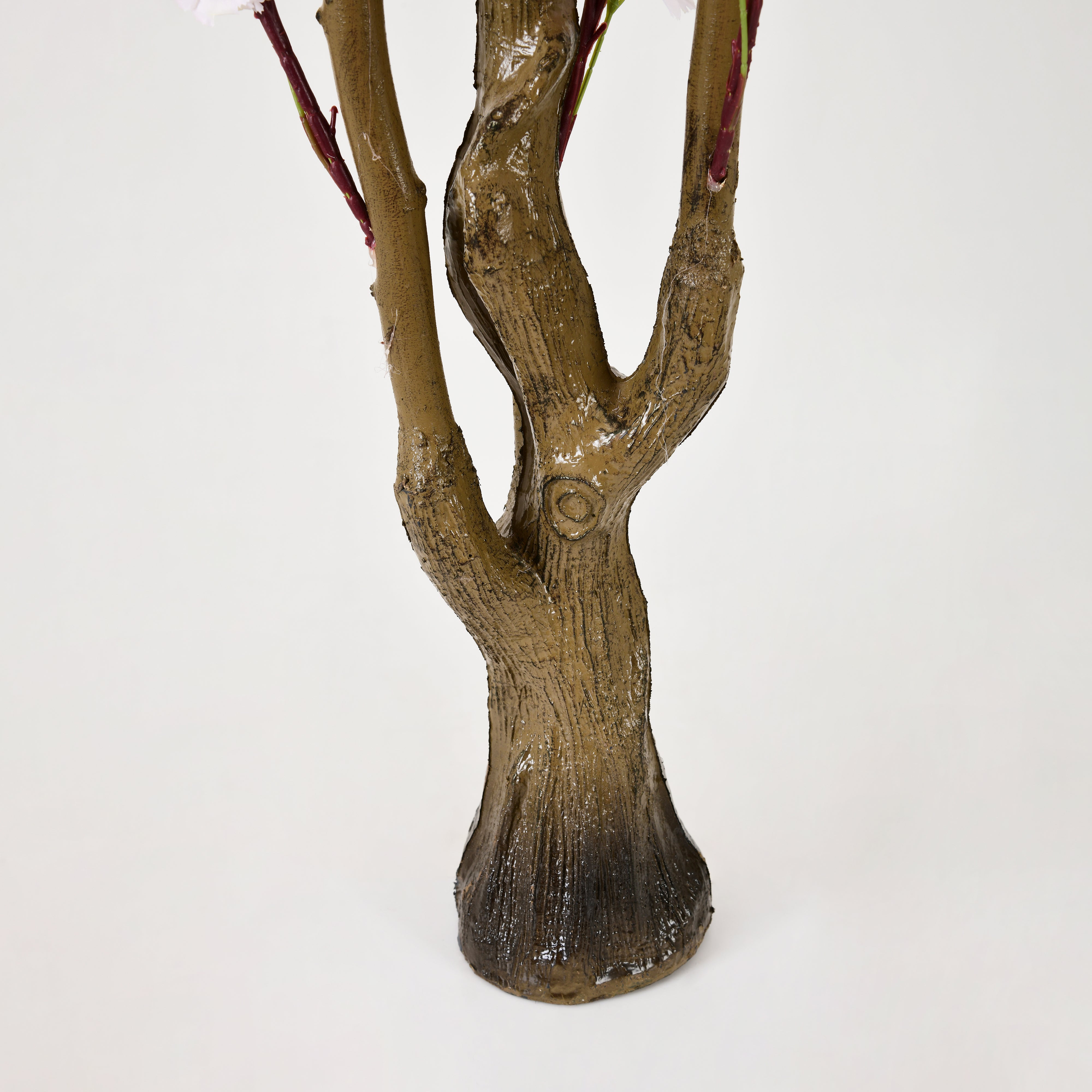 The plant showcases a realistic brown trunk with bark-like texture, resembling aged wood. Several tall branches rise from the trunk, each adorned with clusters of light pink blossoms featuring soft-edged, multi-layered petals that mimic natural flower textures. The subtle tonal variations enhance depth and realism under varying light. Natural green leaves are scattered among the blossoms, providing contrast and a lifelike appearance. The arrangement spreads vertically and outward in a bouquet-like silhouette, offering fullness and visual balance from every angle. Unlike real flowers, these blossoms remain fresh and vibrant throughout the year.