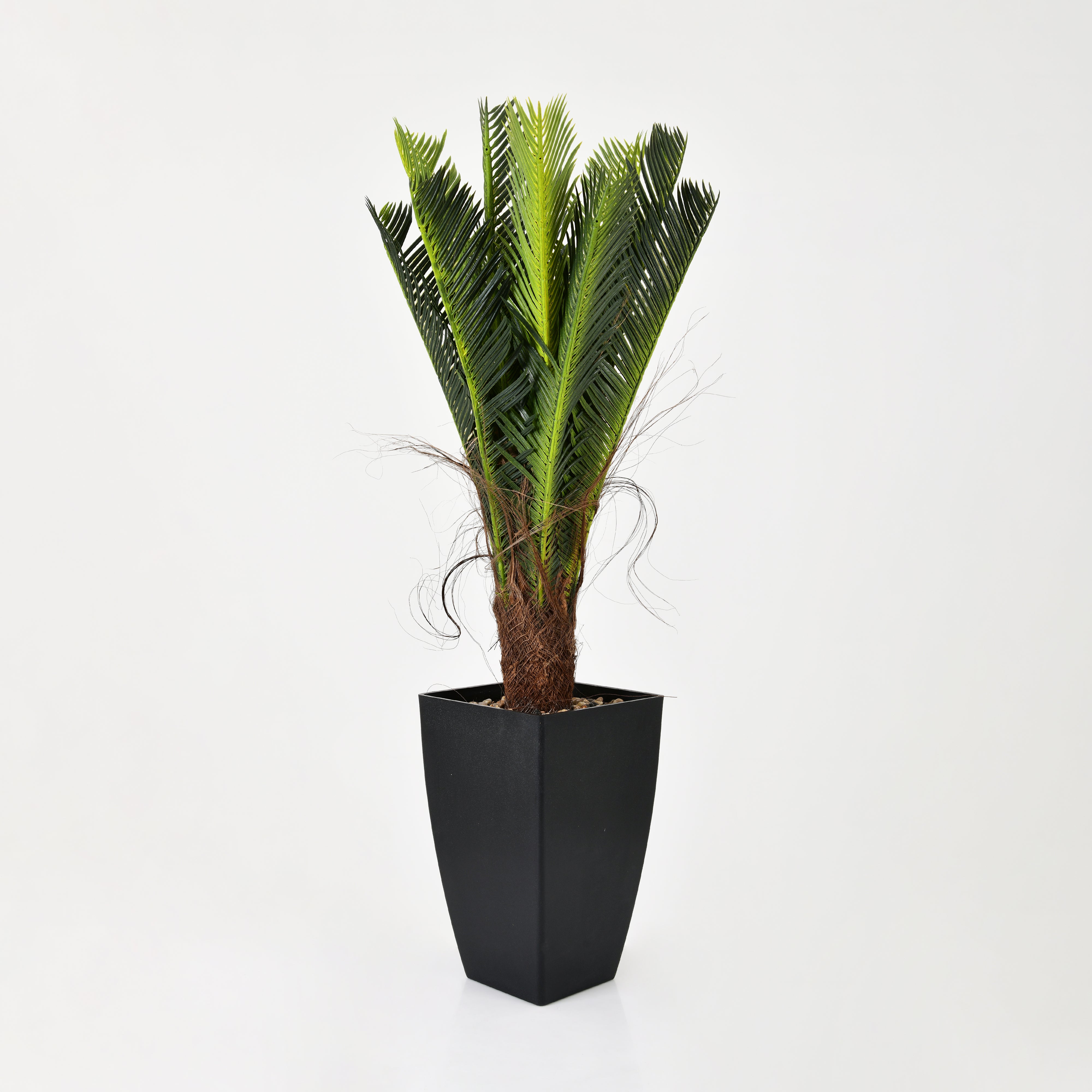 Inspired by sago and cycad palms, this artificial plant features multiple slender fronds that rise gracefully from a central crown. Each frond has finely spaced leaflets along a central midrib, forming a crisp, feathery texture that looks authentic from every angle. The inner leaves display a lighter, yellow-green shade, simulating new growth, while the outer fronds are deeper green for a realistic layered effect. The textured, fibrous trunk mimics coir and aged frond bases, adding lifelike character to the arrangement. The tall, tapered square planter is crafted with a fine matte finish that complements both contemporary and natural interiors. A top layer of decorative river pebbles completes the design, blending the trunk seamlessly into the pot for a polished look.