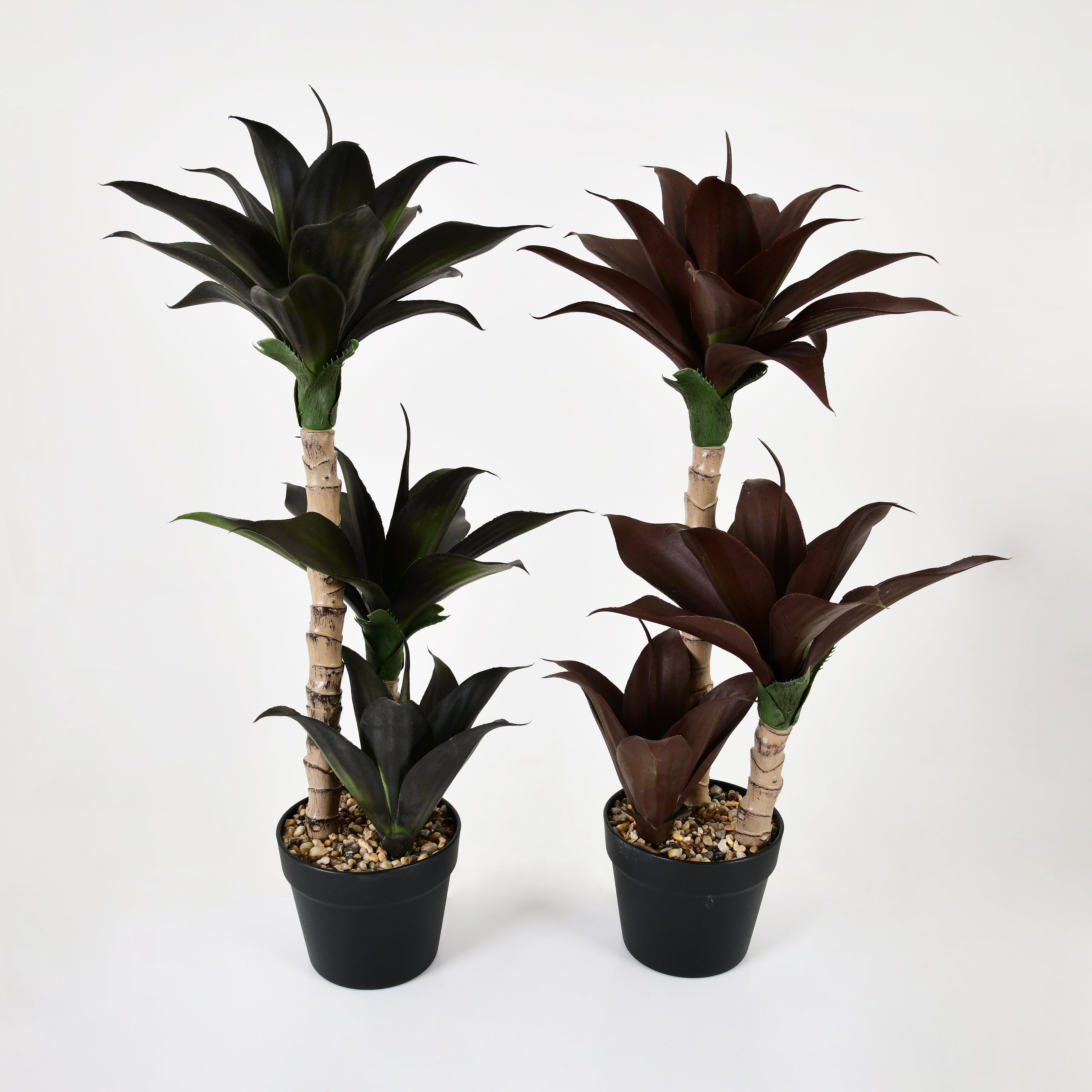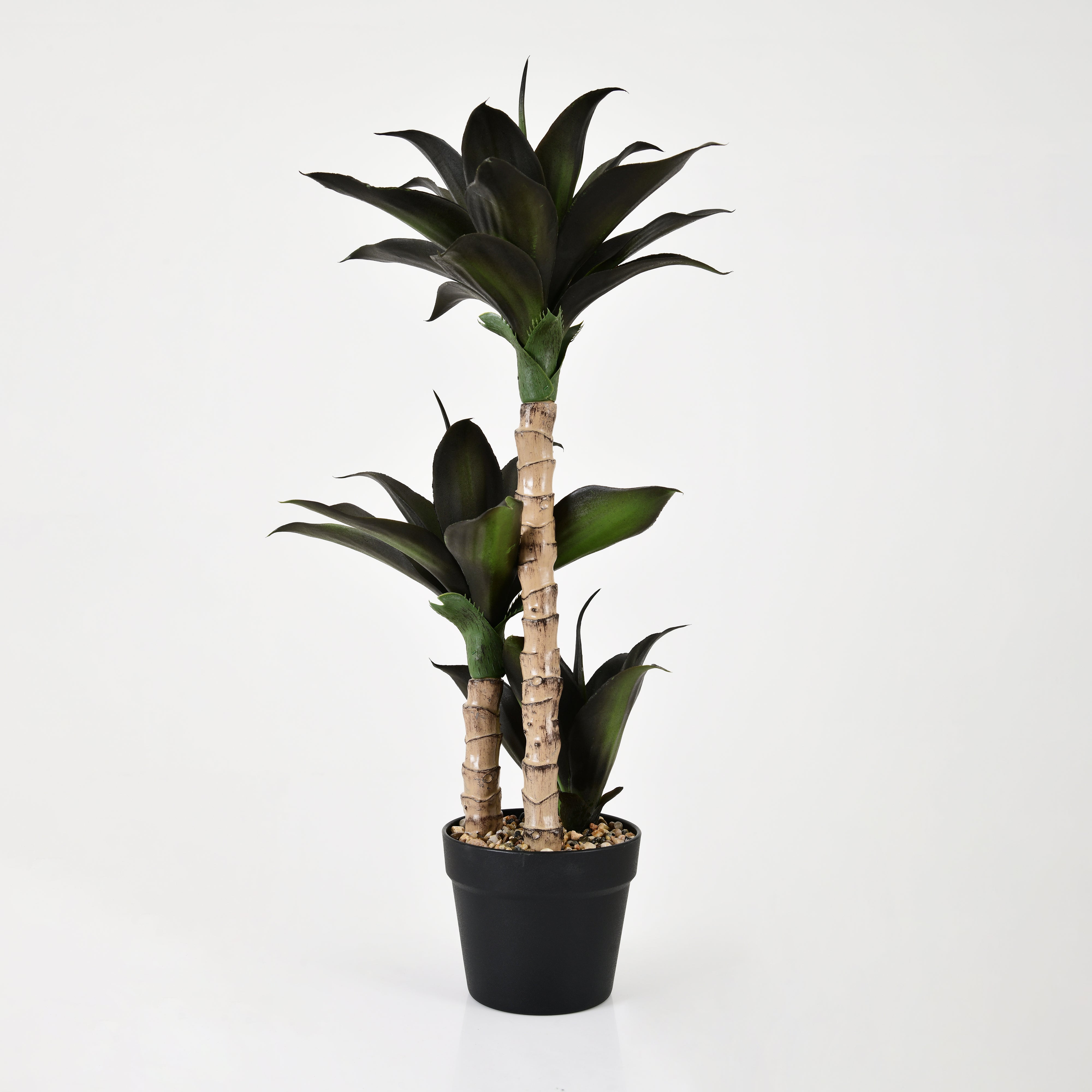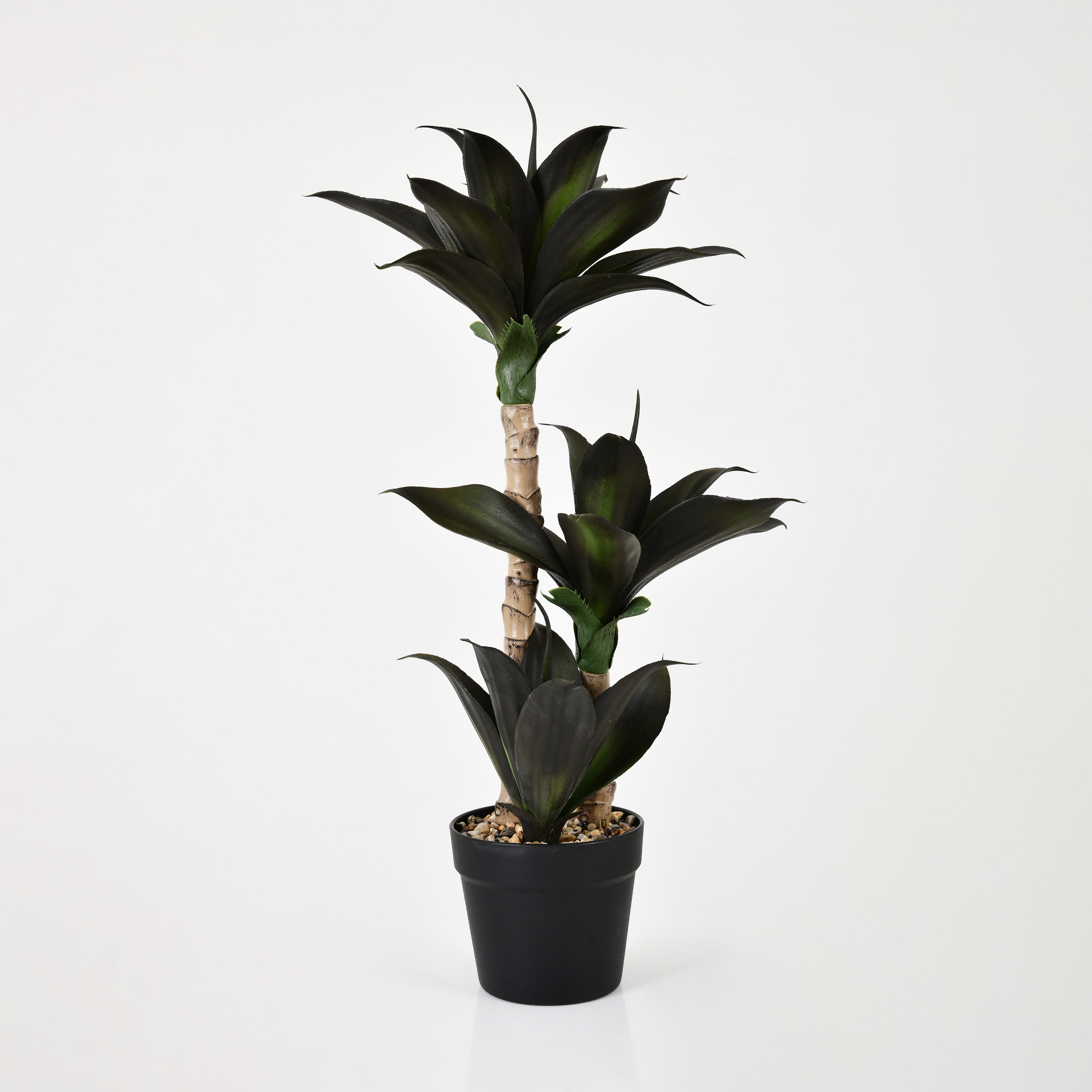 The plant features three sturdy stems of varying heights, each wrapped with realistic bark-like texture. From every stem, a rosette of wide, tapered leaves extends outward, forming a balanced and layered look. The dark green foliage with subtle shading and a satin-matte finish provides a lifelike touch under different lighting conditions. The round, matte black pot offers a minimal and timeless base, complemented by a layer of natural pebbles for a polished, complete appearance.