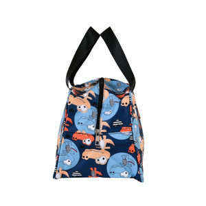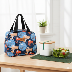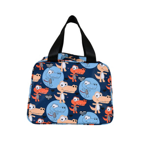 Description: Make lunchtime fun and stylish with this Blue Crocodile Print Thermal Insulated Lunch Bag. Featuring an all-over print of playful crocodiles in shades of orange, beige, and blue on a navy and sky-blue base, this bag blends charm with practicality—perfect for both kids and adults.