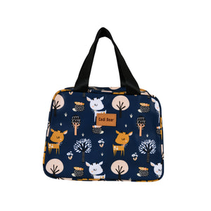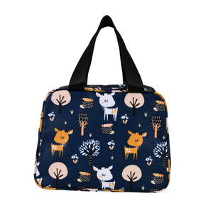 Description: Make lunchtime fun and stylish with this Navy Blue Deer Print Thermal Insulated Lunch Bag. Featuring an all-over print of cute deer, trees, and nature-inspired elements in shades of white, mustard, and peach on a deep navy blue base, this bag combines charm with practicality—perfect for both kids and adults.