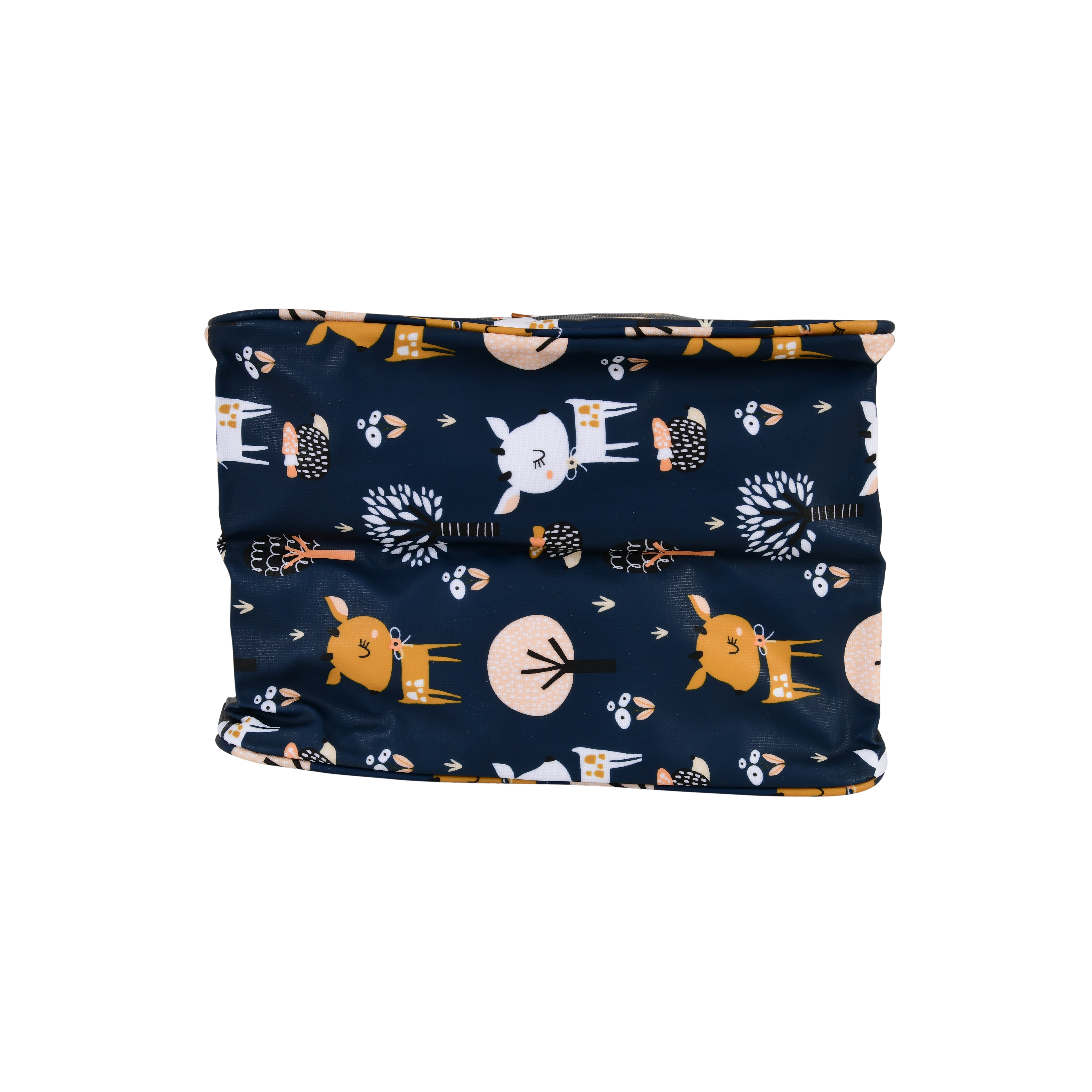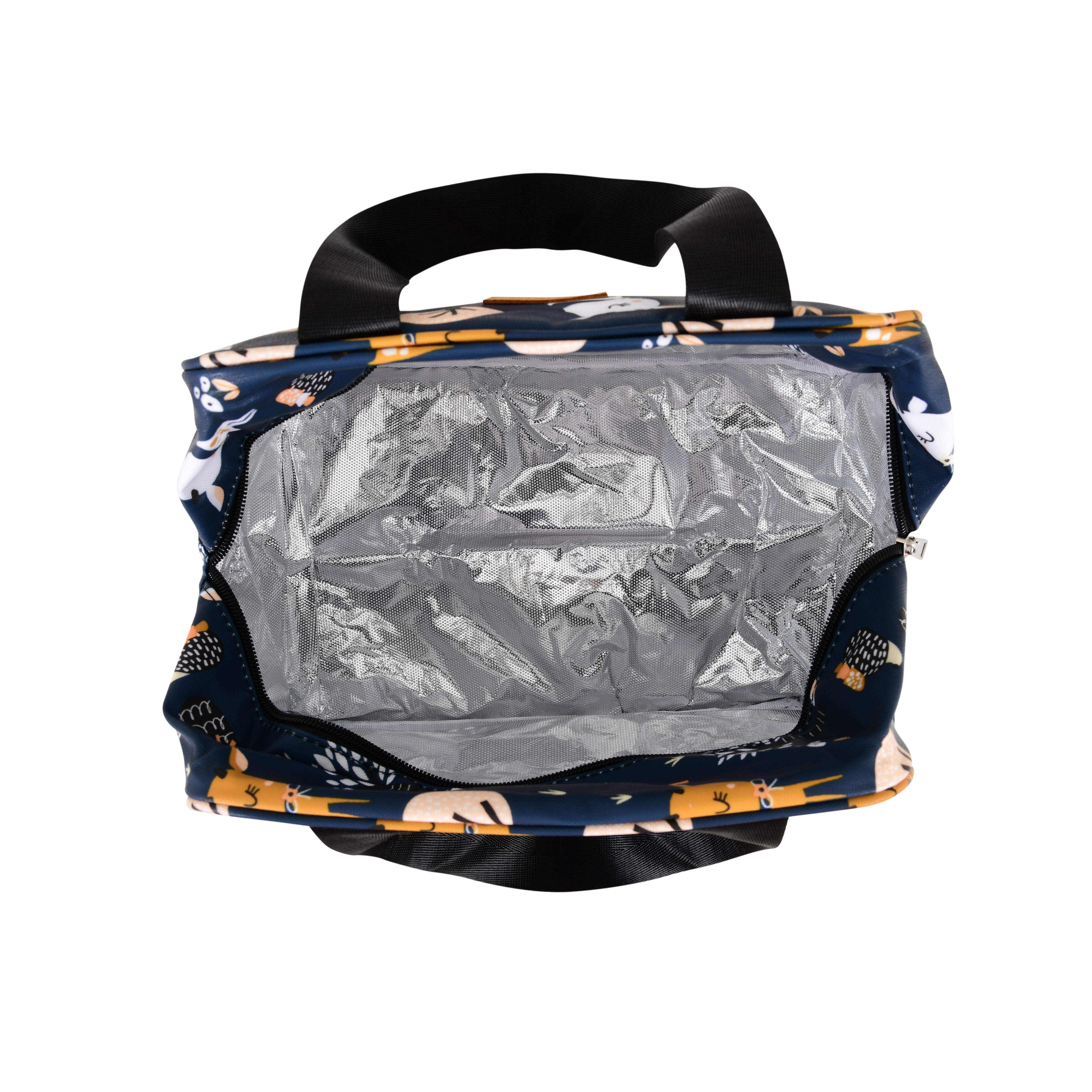 Make lunchtime fun and stylish with this Navy Blue Deer Print Thermal Insulated Lunch Bag. Featuring an all-over print of cute deer, trees, and nature-inspired elements in shades of white, mustard, and peach on a deep navy blue base, this bag combines charm with practicality—perfect for both kids and adults.