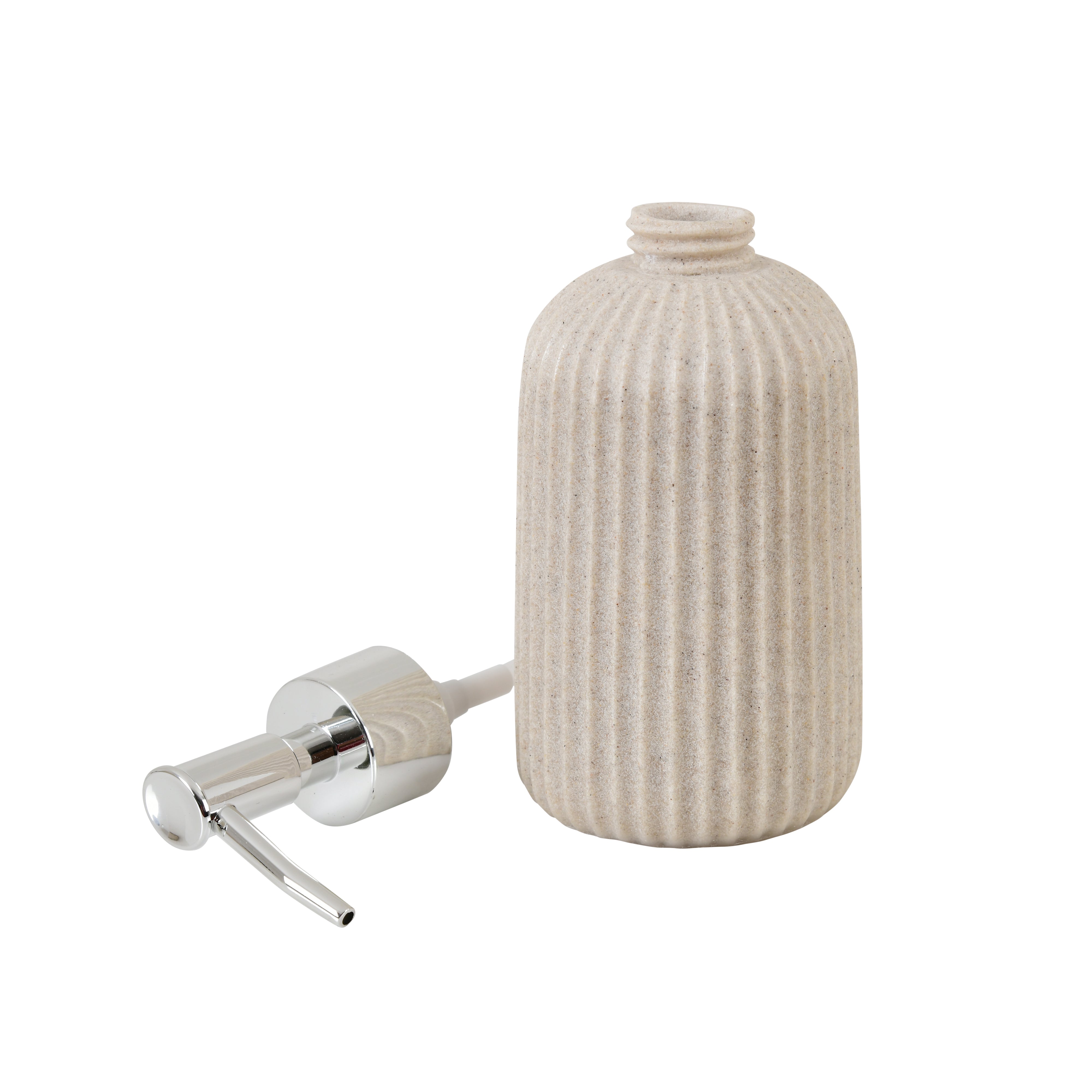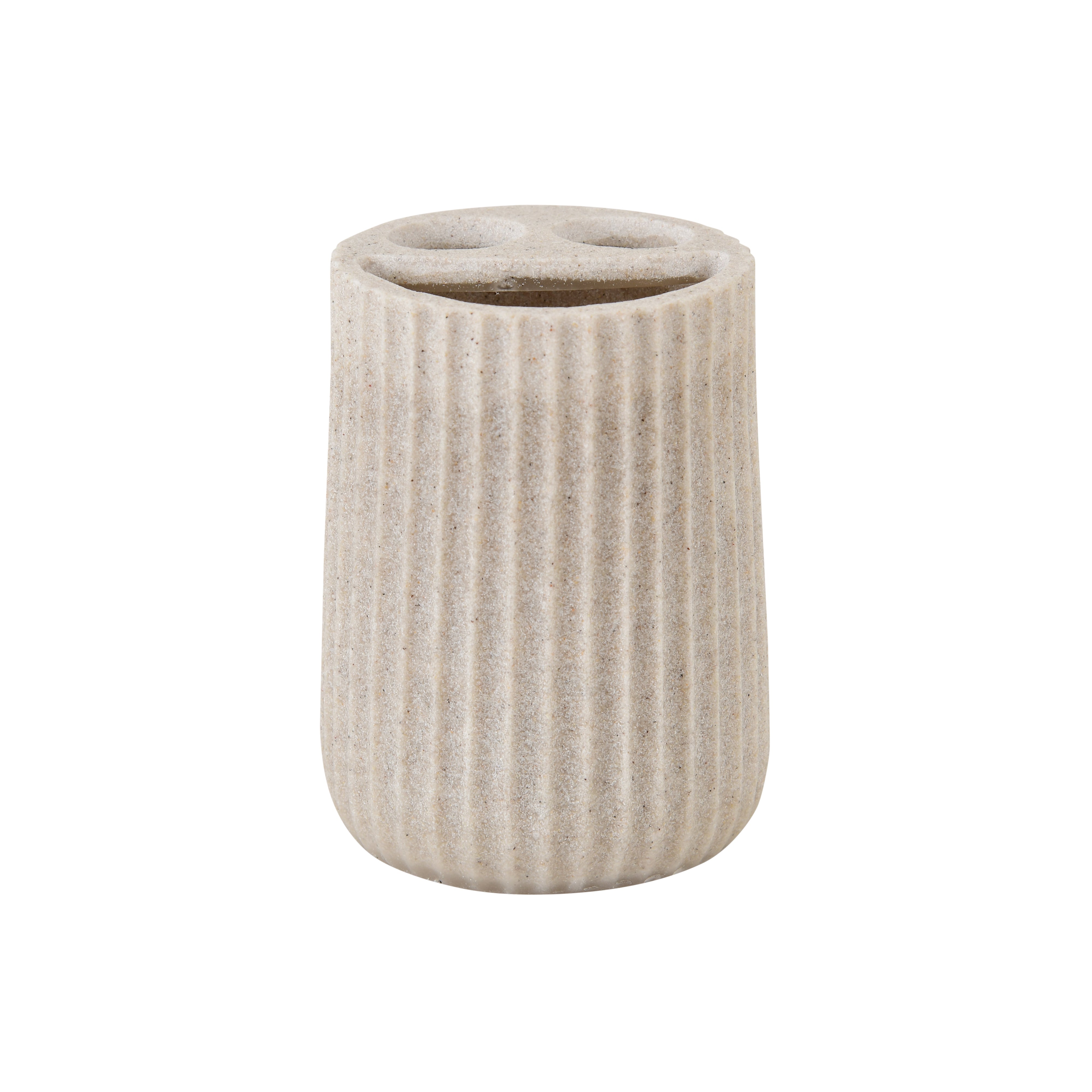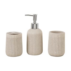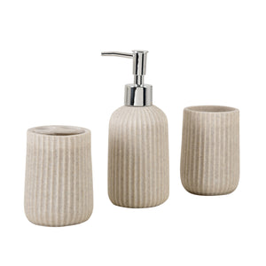This 3-piece bathroom accessory set is thoughtfully crafted to bring style, functionality, and organization to your daily routine. It includes a liquid soap dispenser, a toothbrush holder, and a tumbler, making it a complete solution for bathroom essentials. The neutral beige color and soft textured finish give it a sophisticated look that fits effortlessly into any bathroom décor.