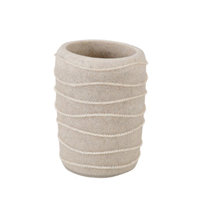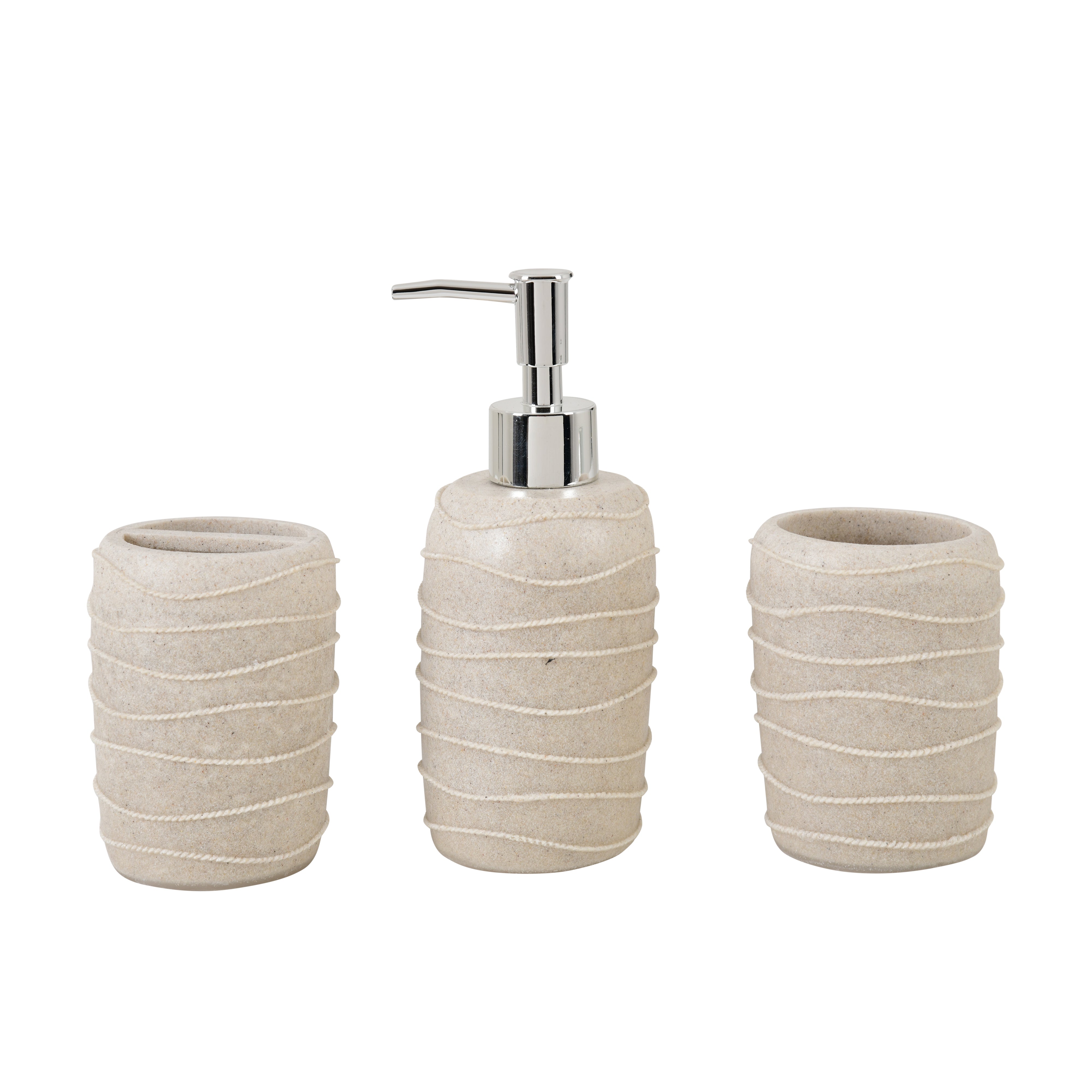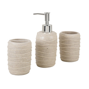 Description:-This 3-piece bathroom accessory set is thoughtfully crafted to bring elegance, functionality, and durability to your daily routine. It includes a liquid soap dispenser, a toothbrush holder, and a multipurpose tumbler, offering a complete solution for organizing bathroom essentials. Featuring a smooth beige stone finish with spiral ribbed detailing and a sleek chrome pump, this set adds sophistication that complements both modern and classic bathroom décors.