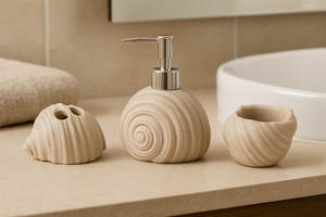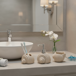 This 3-piece bathroom accessory set is designed to bring elegance and functionality to your space. Inspired by the natural beauty of seashells, the set includes a soap dispenser, a toothbrush holder, and a tumbler, making it a perfect addition to any modern or coastal-themed bathroom décor.