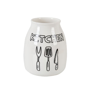 • Holder – Sturdy ceramic jar body with stylish black kitchen-themed prints (“Tool’s” or “Kitchen”), adding a playful yet classy touch to your countertop