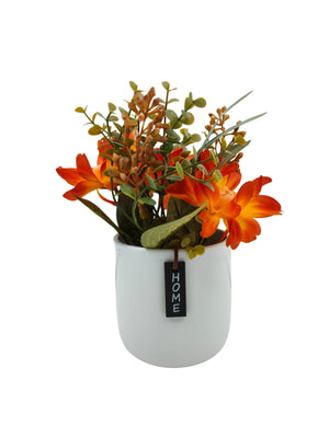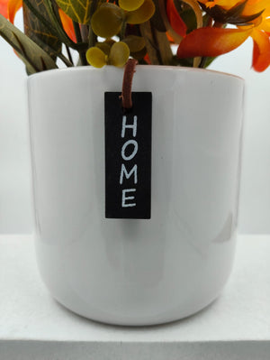 Brighten up your living space with this White Ceramic Planter featuring Artificial Orange Flowers and Green Foliage, beautifully accented with a “HOME” tag for a cozy, welcoming touch. The pot’s glossy white finish and clean, minimal shape exude modern elegance, making it a versatile décor piece that fits effortlessly into any interior style—from contemporary and chic to warm and rustic.