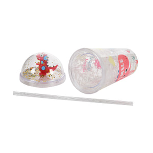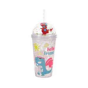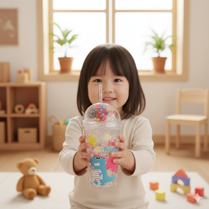 Make hydration magical with the Lovely Dino Kids Cup Bottle. Featuring a playful blue dinosaur with pink wings print and a dome lid topped with a 3D red dino figure, this bottle instantly captures kids’ attention. The transparent crystal-effect body with glitter accents adds a whimsical touch, making it perfect for school, playtime, or outings.