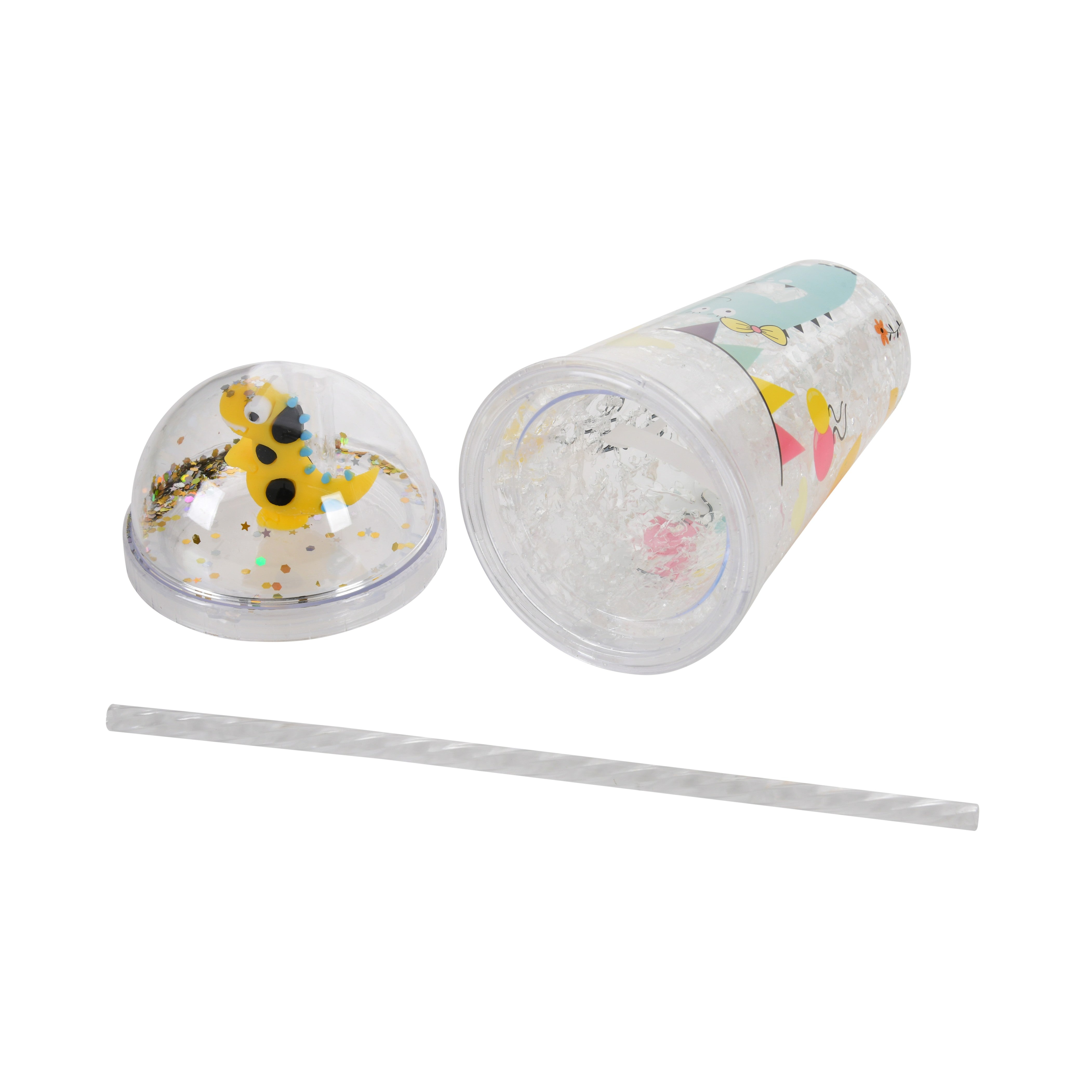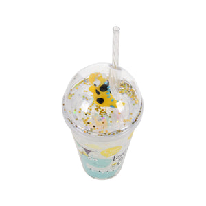 Make hydration fun for your little ones with this Lovely Dino Kids Cup Bottle. Designed with a playful blue dinosaur print with a yellow bow and a dome lid topped with a 3D yellow dino figure, this bottle is sure to delight kids and make drinking water exciting. The transparent body with a crystal ice-effect and glitter accents adds a fun sparkle, making it a favorite for school, playtime, or outings.