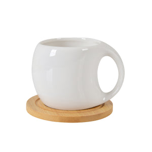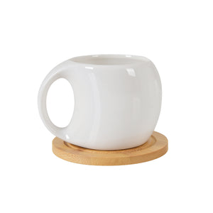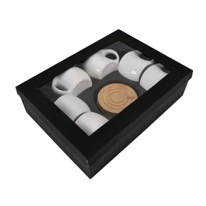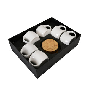 Modern White Ceramic Coffee Cup Set – Durable Cups with Wooden Coasters (Pack of 6)