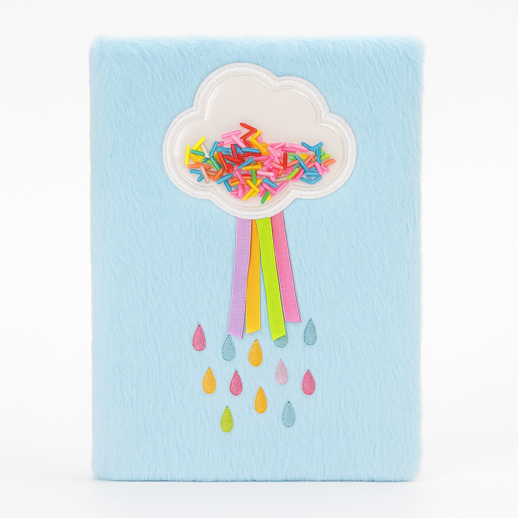 - Cute Design: Front cover features a white cloud patch with colorful sprinkle details, rainbow ribbons, and embroidered raindrops.