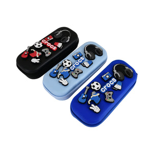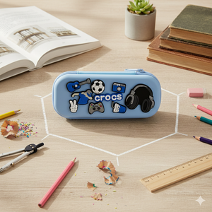 Show off your personality with this DIY Music & Sports-Themed Pencil Box in light blue. Designed for students and teens who love expressing their unique style, it comes with cool removable 3D stickers like a blue guitar, soccer ball, Crocs logo, gaming controller, headphones, sneakers, and peace sign. Mix and match the stickers to create your own custom look anytime you want.
