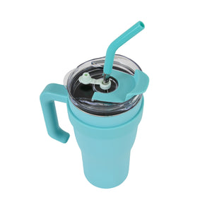 Stay refreshed in style with this sleek aqua blue tumbler with handle, designed to keep your favorite drinks close at hand all day long. Featuring a modern matte finish, it comes with a transparent flip-top lid and a reusable stainless steel straw with a soft silicone tip for smooth and convenient sipping. The ergonomic handle ensures a secure grip, making it perfect for use at home, in the office, while traveling, or during outdoor activities. Suitable for both hot and cold beverages, this tumbler brings together functionality and modern design.