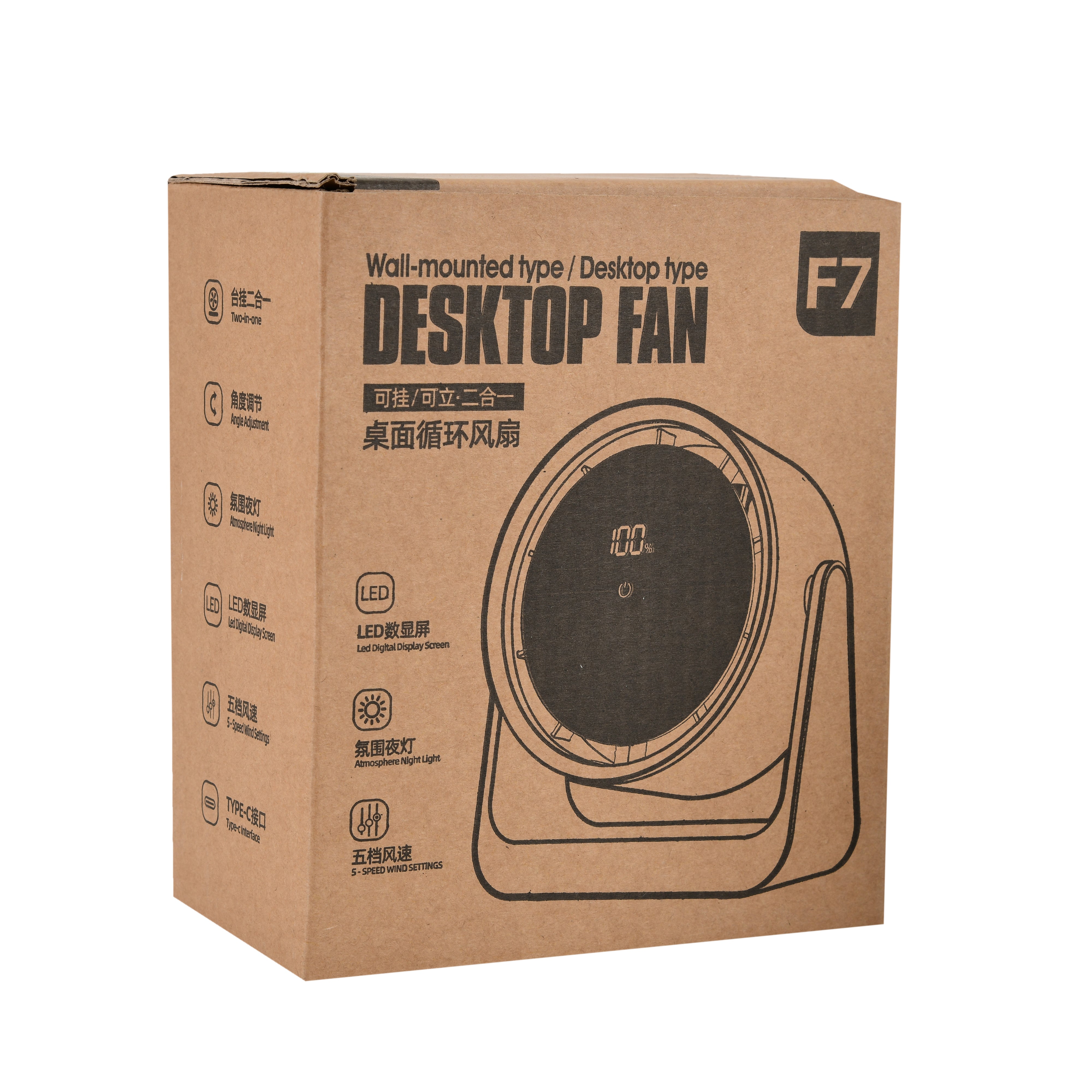 The F7 Touch Mini Table Fan offers elegant, button-free operation for any personal space. Tap the front hotspot to power on/off or switch between five wind modes, including a natural cycle. Long-press to activate the ambient LED night light. Its compact 19 × 17 × 7.5 cm body fits desks, dressers, or wall spaces, and the brushless motor delivers silent, efficient airflow. USB Type-C rechargeable battery ensures 2–8 hours of runtime depending on speed. The included wall hook allows easy mounting, making it ideal for bedrooms, kitchens, offices, and dorms.