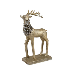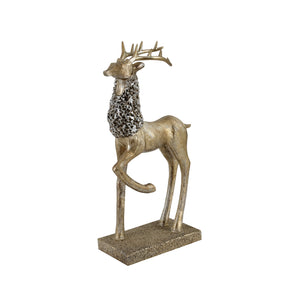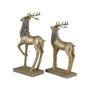 The abstract-modern design emphasizes elegance and symbolic meaning. Handcrafted textures highlight realistic antlers and body detailing, while the antique gold finish with snow-wash accent enhances the luxurious and artistic appeal. The complementary postures of the two deer create visual balance, making the pair ideal for display together or separately across various spaces.