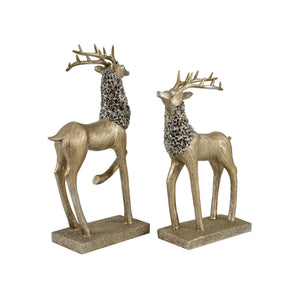 The Elegant Deer Figurine Set of 2 symbolizes grace, harmony, and natural beauty. Crafted from premium polyresin, these figurines feature a luxurious antique gold finish with finely textured detailing across the body, complemented by a snow-wash accent on the neck that adds depth and sophistication. One deer is depicted with a raised leg while the other gazes upward, creating a dynamic and balanced pair that brings elegance and movement to any interior. The elongated antlers and sleek forms reflect modern artistry while preserving the symbolic essence of deer, representing peace, prosperity, longevity, and harmony.