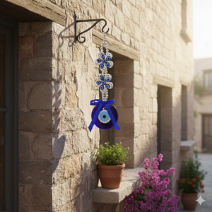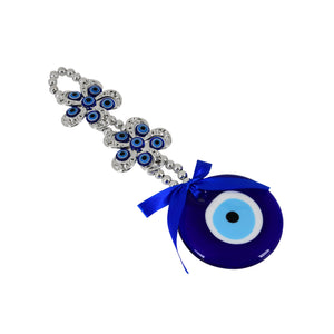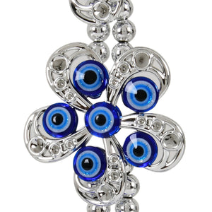 Bring positivity and protection into your home with this elegant Evil Eye Wall Hanging featuring a dual floral design. The piece showcases two beautifully crafted silver-toned floral motifs adorned with small evil eyes, complemented by a striking large blue evil eye disc at the bottom. Finished with a decorative satin ribbon, it combines spiritual significance with aesthetic appeal.