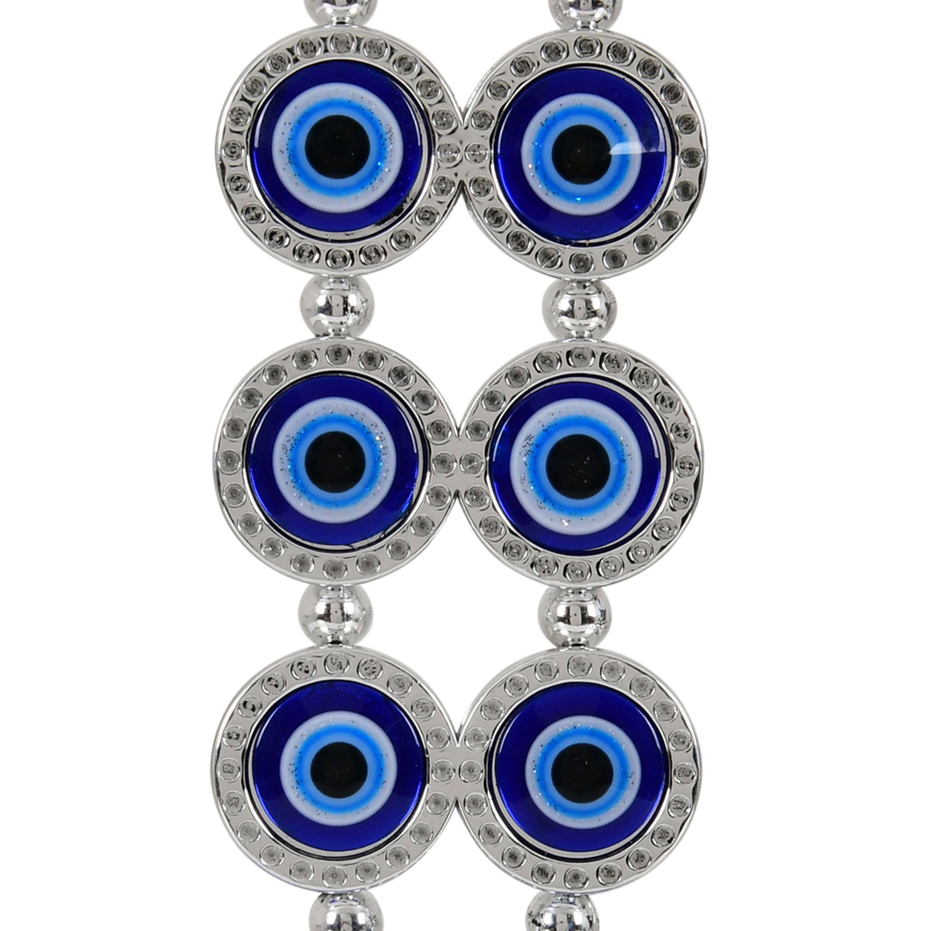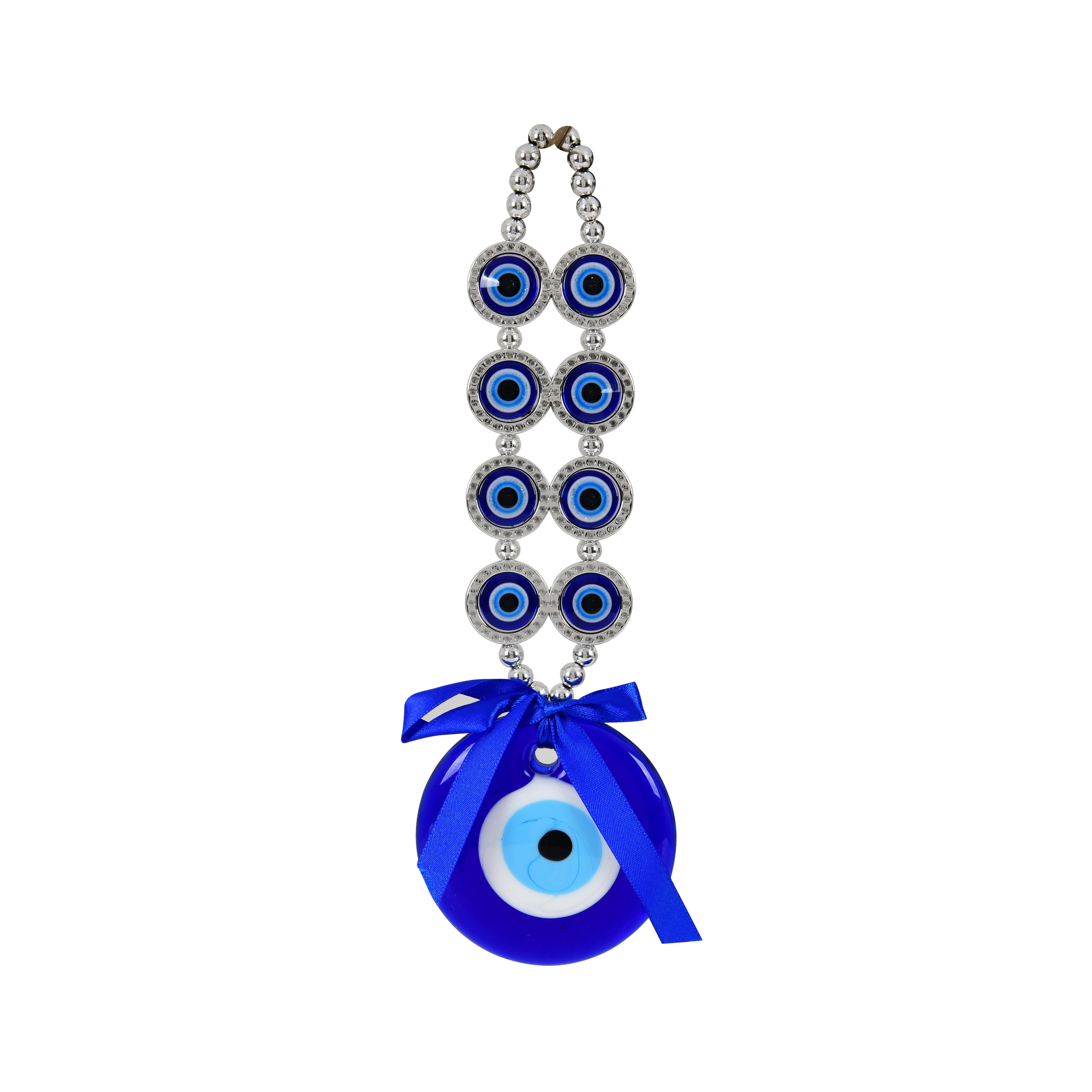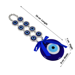 Add charm and protection to your space with this Elegant Evil Eye Hanging featuring multiple mini eyes. The design includes seven small evil eye motifs in a silver-toned frame, beautifully aligned and leading to a large central blue glass evil eye disc, finished with a satin ribbon. This piece blends aesthetic appeal with deep spiritual significance.