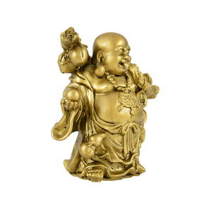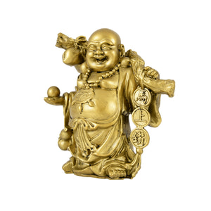 This beautifully crafted Golden Laughing Buddha Idol is a symbol of prosperity, happiness, and abundance. Designed with intricate detailing, the idol depicts the Laughing Buddha holding a wealth ball in one hand (symbolizing wisdom and fulfillment of wishes) and carrying a sack on his shoulder (representing the removal of life’s troubles). Hanging coins by his side further symbolize wealth, financial stability, and good fortune.