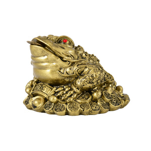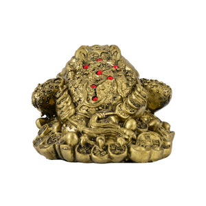 This Feng Shui Three-Legged Money Frog (Toad), also known as Chan Chu or Jin Chan, is a powerful symbol of wealth and prosperity in Chinese tradition. The golden figurine features the toad sitting on a pile of coins and ingots, with a coin in its mouth, symbolizing continuous inflow of money and abundance. The red eyes and detailed carving on its back enhance its auspicious energy, making it a perfect addition to homes, offices, or business spaces.