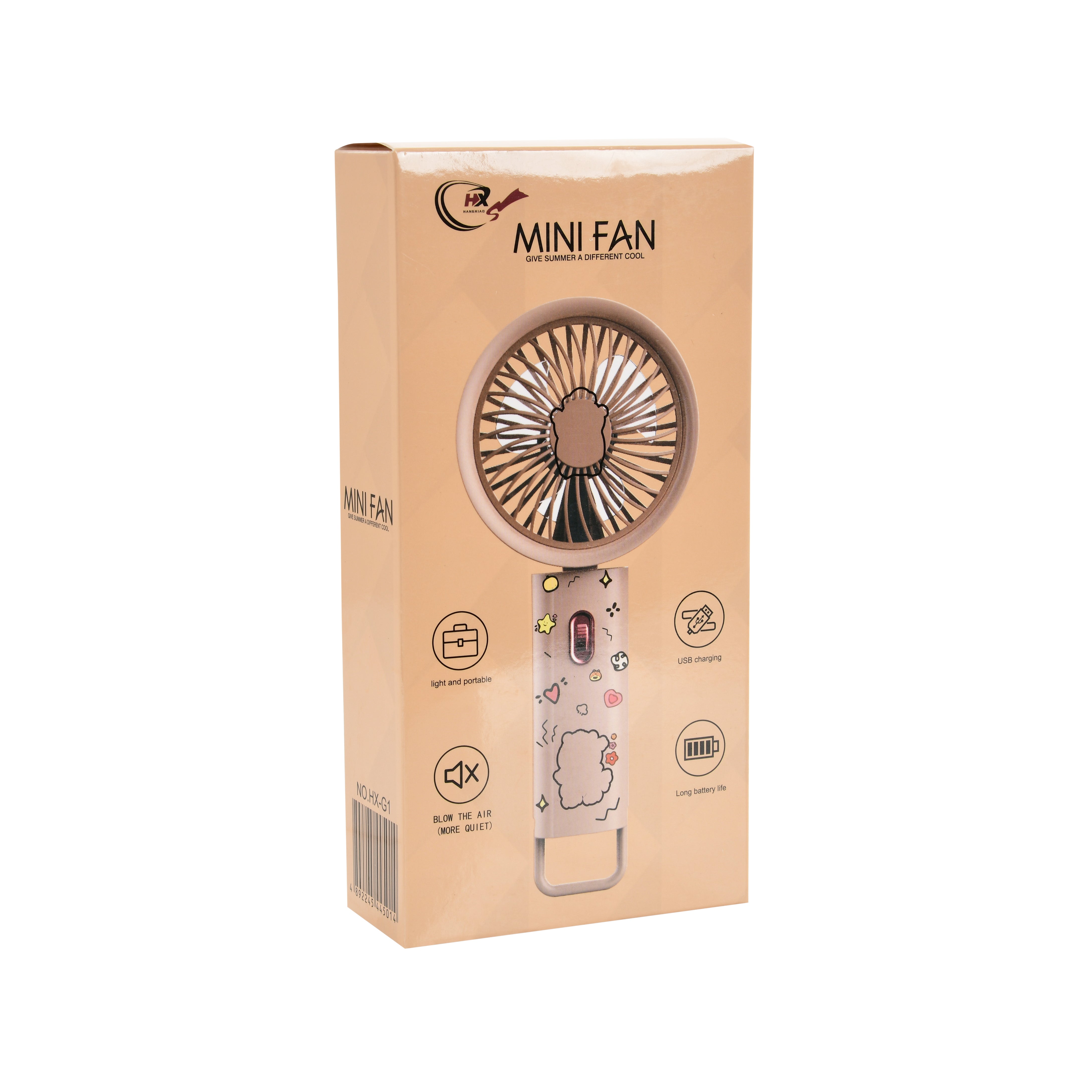 Stay cool anywhere with this compact, quiet, and portable mini fan. Its Coffee Brown ABS body is lightweight yet durable, with a fold-out stand for hands-free desk use and a 3-speed slider for customized airflow. USB rechargeable and complete with a DIY sticker sheet, you can personalize your fan while keeping it ready for travel, work, or home.