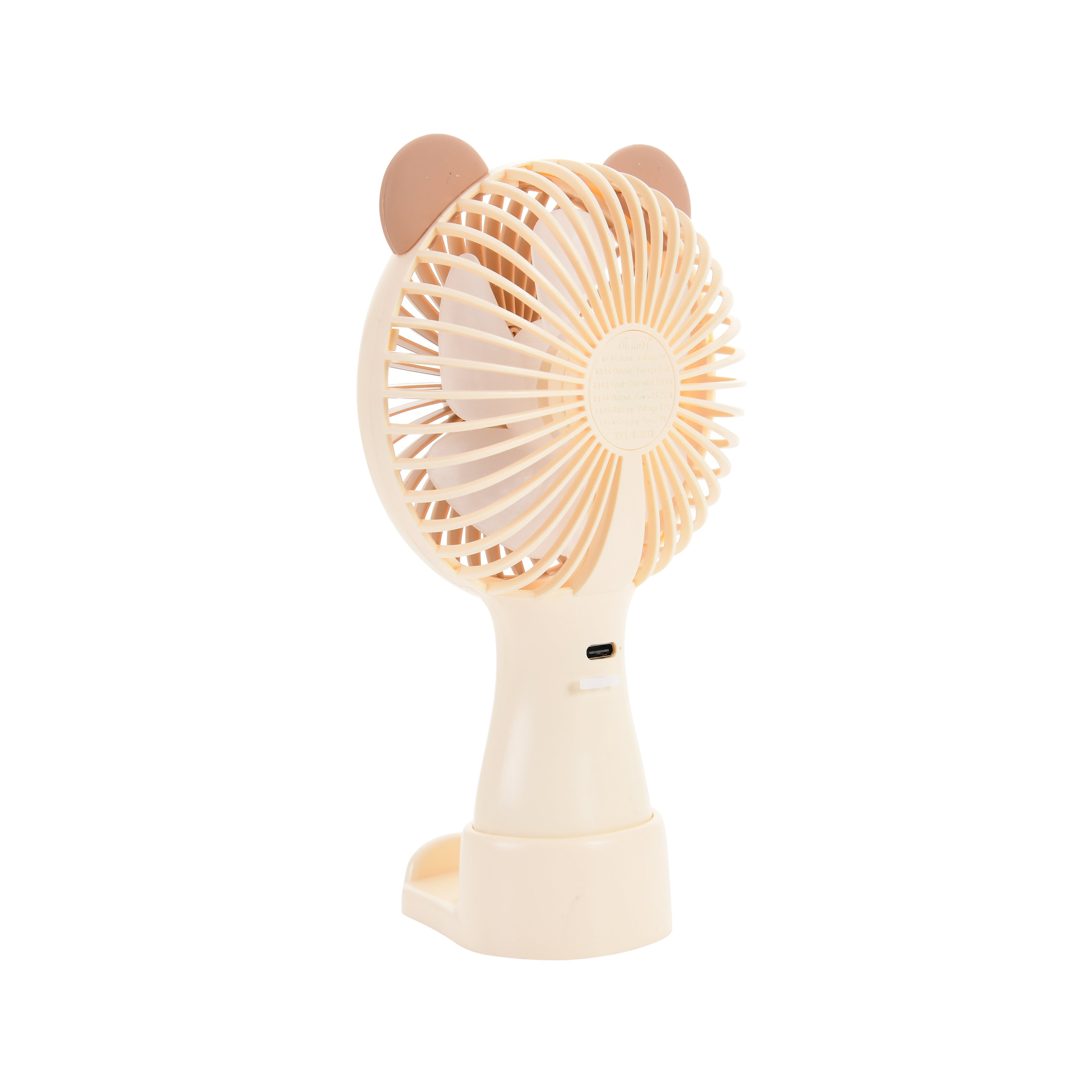 Cute Bear-Themed USB Rechargeable Handheld Mini Fan with Stand – Beige and Brown (3-Speed, 18×7×10 cm, 115 g)