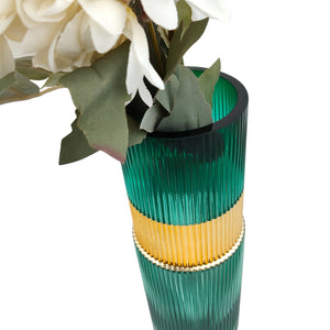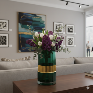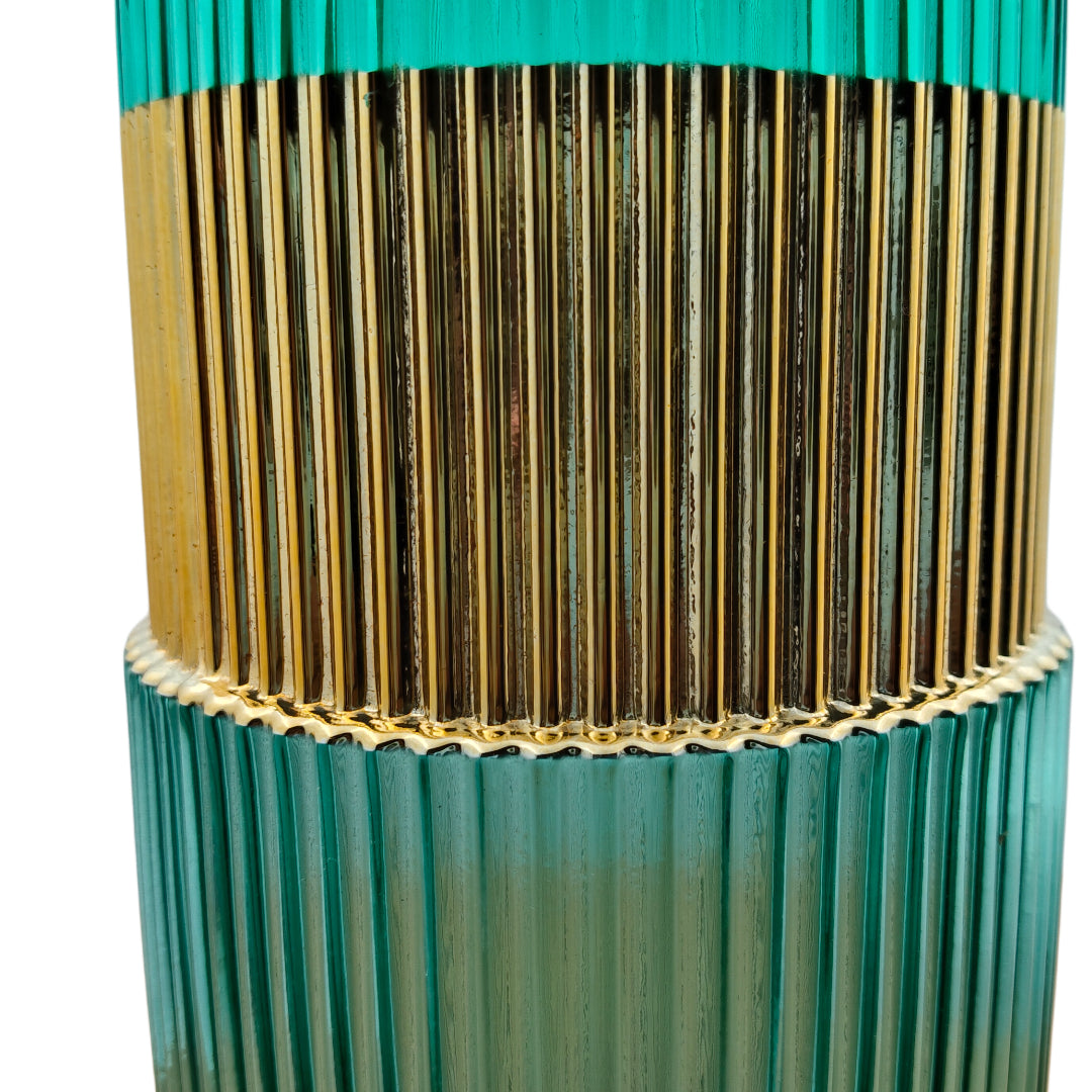 This vase set features a premium turquoise ribbed glass body combined with a striking gold band detail that adds a luxurious and modern touch. The vertical textured pattern enhances the visual height and elegance, making these vases stand out as décor pieces even without flowers. They are perfect for home décor, office décor, restaurants, studios, and high-end gifting.