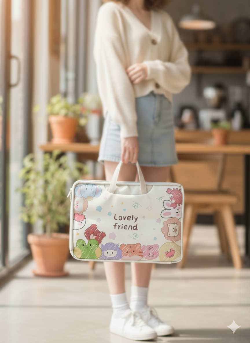 Keep your daily essentials protected and organized with this adorable Lovely Friend Laptop & Document Bag. Designed with a cute multi-character cartoon print, this bag brings a fun and cheerful touch to your everyday routine. The slim yet protective structure makes it perfect for students, professionals, and anyone who wants a lightweight, stylish solution for carrying their devices and documents.
