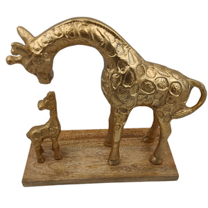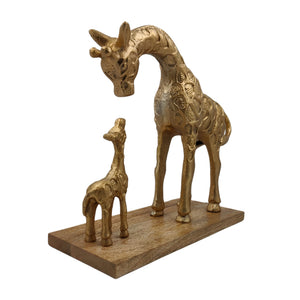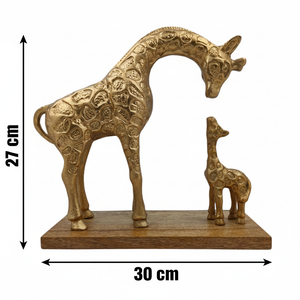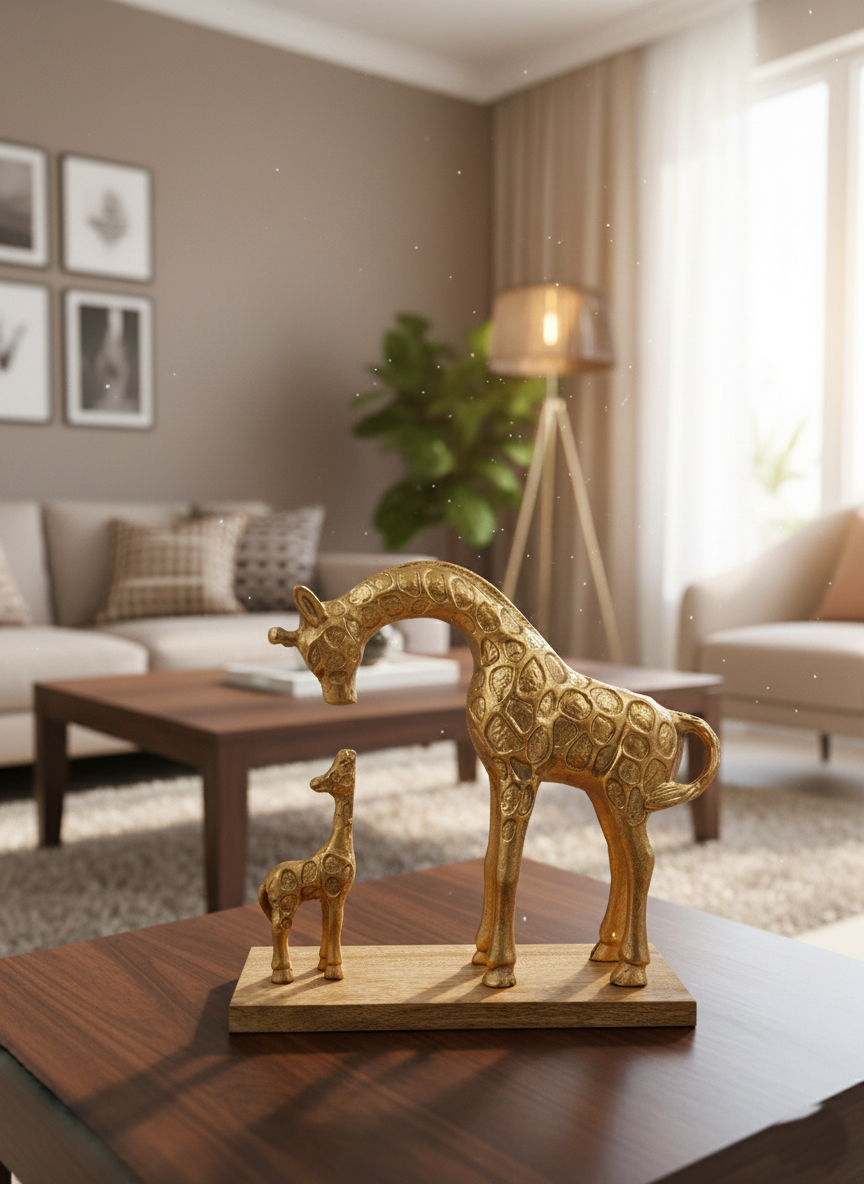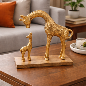The Majestic Giraffe Figurine Set of 2 beautifully represents love, protection, growth, and harmony. Crafted with a premium brass-coated finish, this elegant mother-and-baby giraffe showpiece features rich textured detailing inspired by natural giraffe patterns. The graceful posture of the mother giraffe bending towards the baby creates a warm emotional connection, making it a meaningful and visually striking décor piece. Mounted on a sturdy wooden base, the figurines offer excellent stability while the natural wood tone contrasts beautifully with the antique brass finish. The elongated forms and artistic proportions add sophistication, making this showpiece suitable for modern, contemporary, and luxury interiors. Perfect as a tabletop accent, shelf décor, or office desk centerpiece, it adds warmth, elegance, and positivity to any space. It also makes a thoughtful gift for housewarmings, weddings, anniversaries, festive occasions, or corporate gifting.