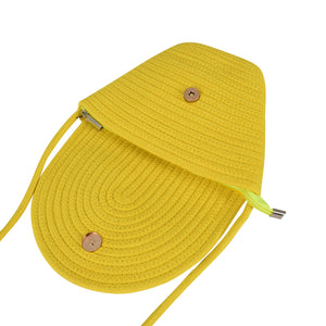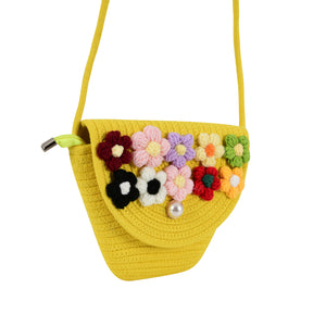 This Mini Cotton Woven Tote Bag is a stylish and functional accessory designed for women who love compact yet fashionable handbags. Made from premium handwoven cotton, it features a bright yellow base adorned with colorful floral embellishments that add a playful and vibrant charm. The flap is secured with a chic magnetic pearl button closure, combining elegance with easy access.