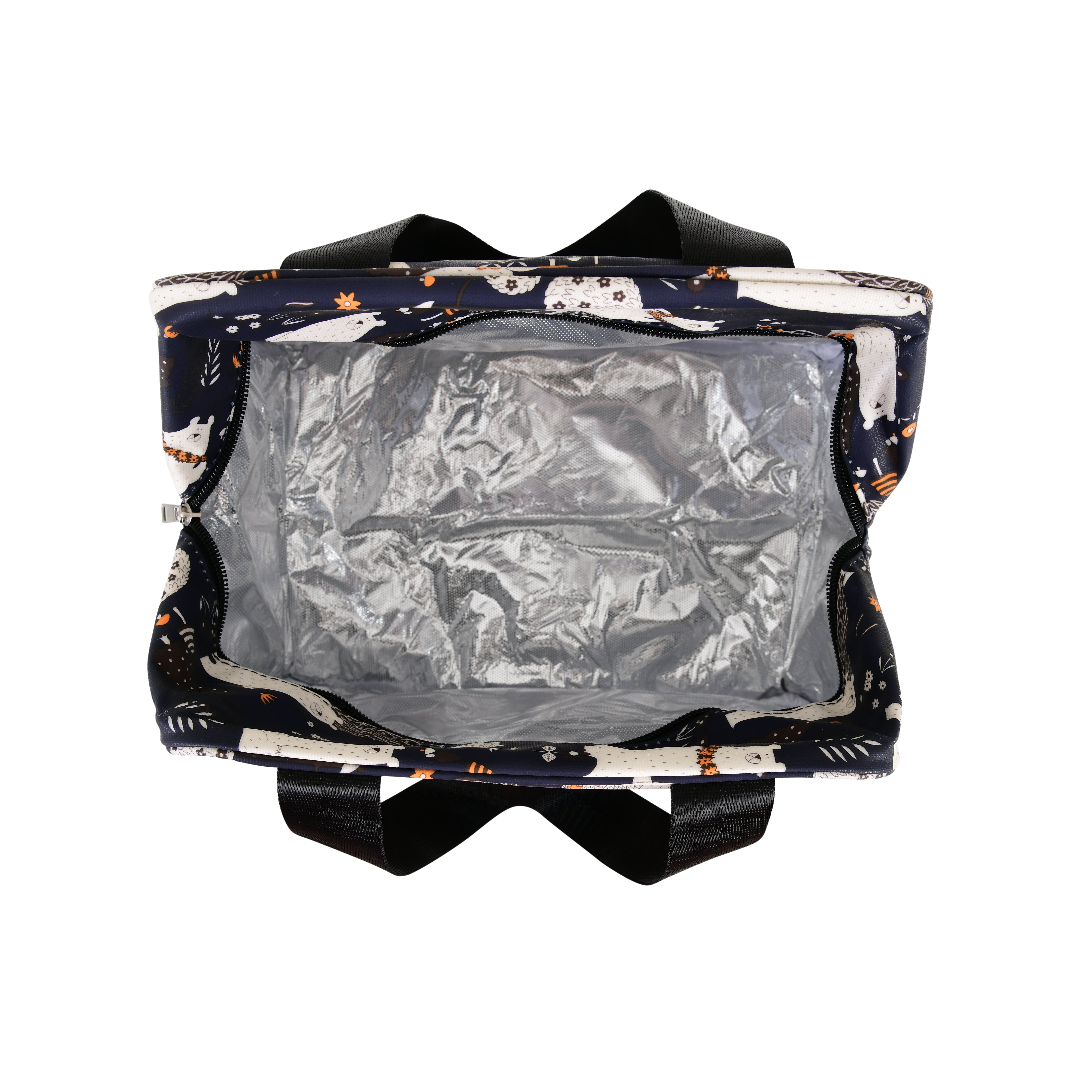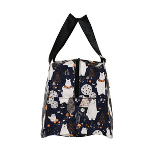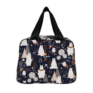 Description: Make lunchtime fun and stylish with this Navy Blue Polar Bear Thermal Insulated Lunch Bag. Featuring an all-over print of cute polar bears, trees, and florals in shades of white, orange, and brown on a navy blue base, this bag blends charm with practicality—perfect for both kids and adults.