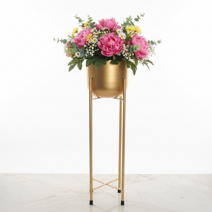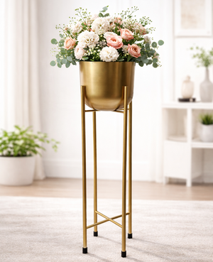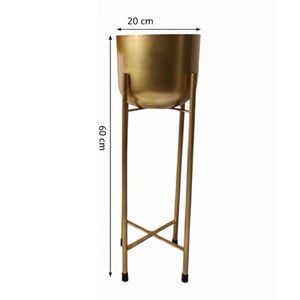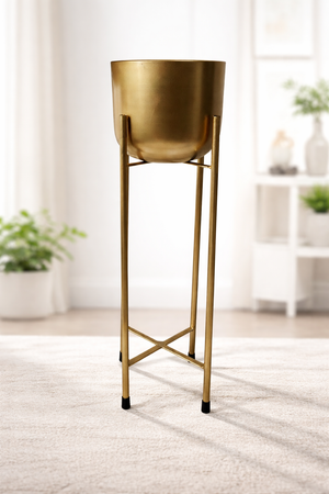 This decorative tall pot features a premium brass-coated metal planter mounted on a sleek, elevated stand, creating a refined and elegant statement piece for modern interiors. The clean cylindrical pot combined with the minimal metal stand adds height, balance, and visual sophistication, making it a perfect décor accent even without plants. Its luxurious yet understated design blends seamlessly with contemporary, modern, and premium spaces, ideal for living rooms, offices, hotel lobbies, studios, and upscale interiors.