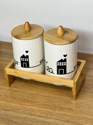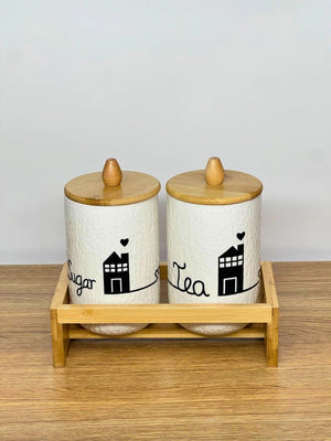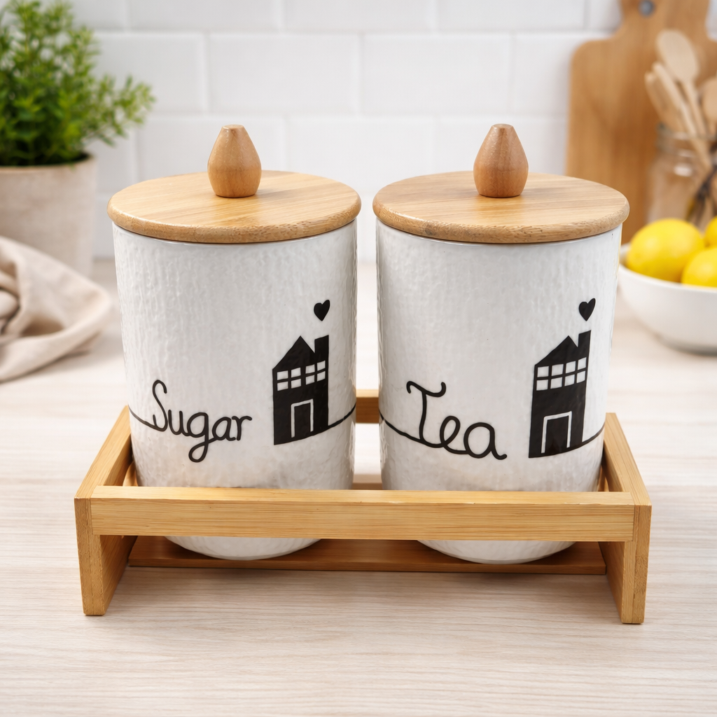 Enhance your kitchen organization with this elegant 2-piece ceramic storage jar set, designed to combine functionality with modern aesthetics. Crafted from high-quality textured ceramic and paired with a natural bamboo tray, this set is perfect for storing tea, sugar, coffee, or daily essentials. Its minimal yet stylish look adds a clean and sophisticated touch to your kitchen countertop while keeping everything neatly arranged.