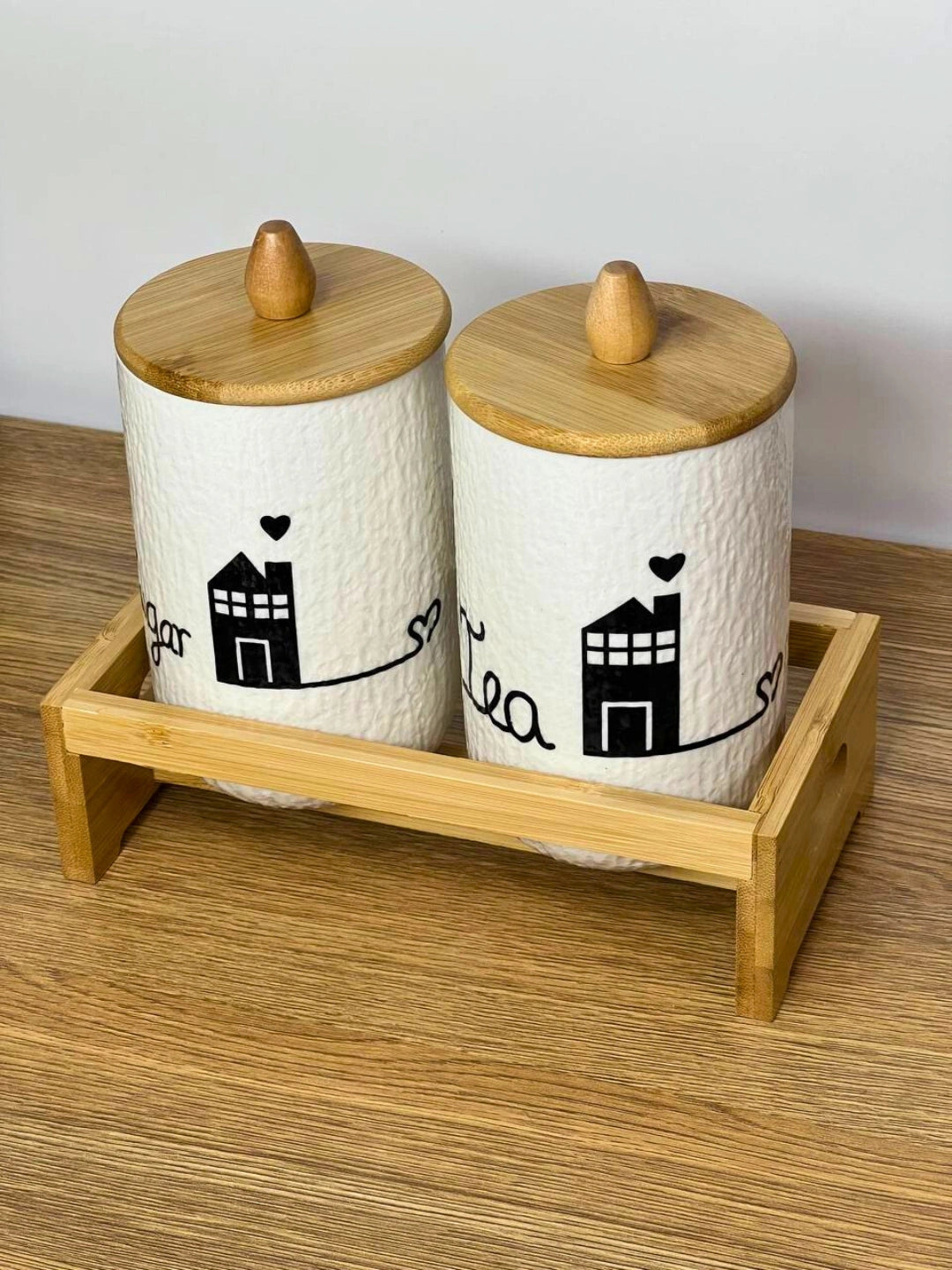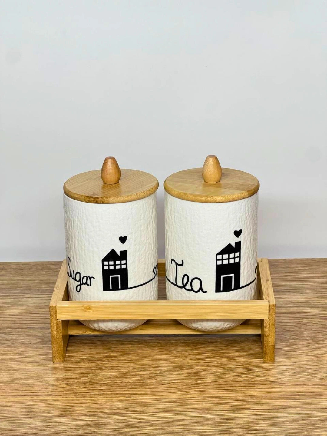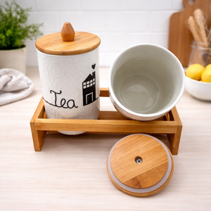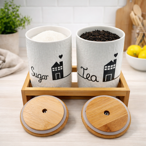This set includes two beautifully crafted white ceramic jars featuring a subtle textured finish for a premium feel. Each jar is detailed with minimal black “Tea” and “Sugar” typography along with a charming house illustration, giving it a modern yet cozy vibe. The jars are topped with smooth bamboo lids with knob handles for easy access. The sturdy bamboo tray with side cut-out handles ensures stability and adds a natural aesthetic touch.