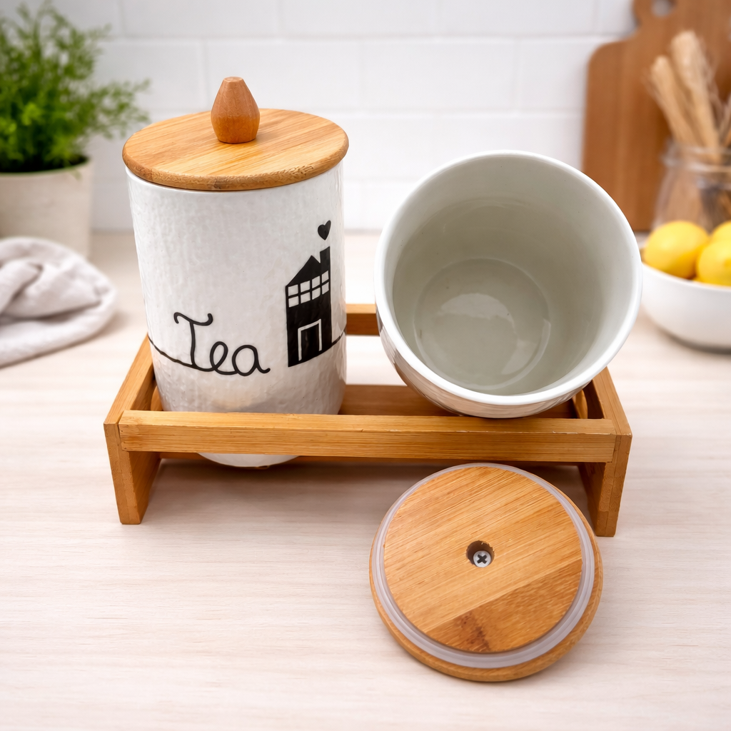 Designed to keep your kitchen clutter-free while enhancing visual appeal, this set is both practical and decorative. The durable ceramic construction ensures long-lasting use, while the bamboo tray adds strength and portability. Its aesthetic design also makes it a thoughtful gifting option for housewarmings, weddings, or festive occasions.