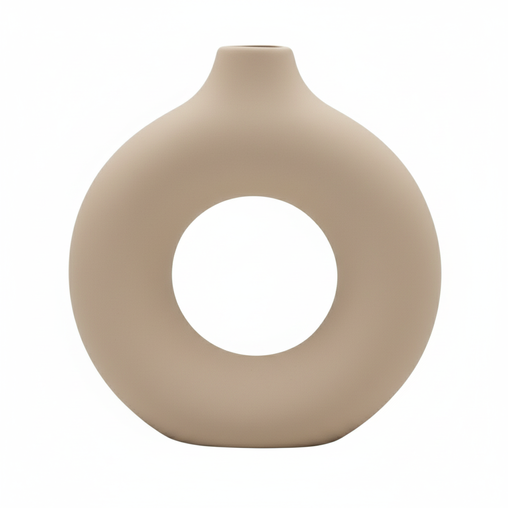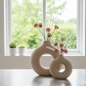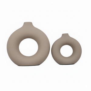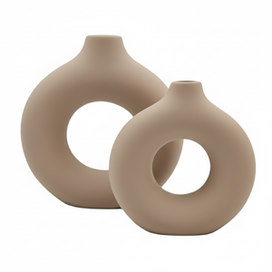 Add a bold, modern statement to your décor with this Set of 2 Decorative Beige Ceramic Vases. Designed in a contemporary donut shape with a smooth matte finish, these vases bring a touch of artistic elegance to any space. Their unique hollow-centre design makes them stand out whether styled with dried stems, pampas grass, or displayed as standalone décor pieces. The soft purple shade adds a chic, modern vibe that complements both minimal and luxury interiors.