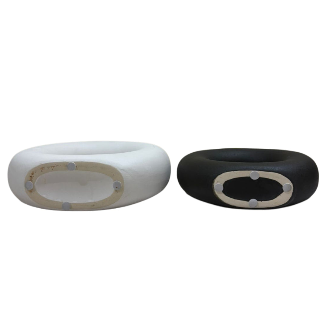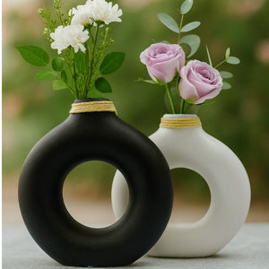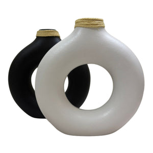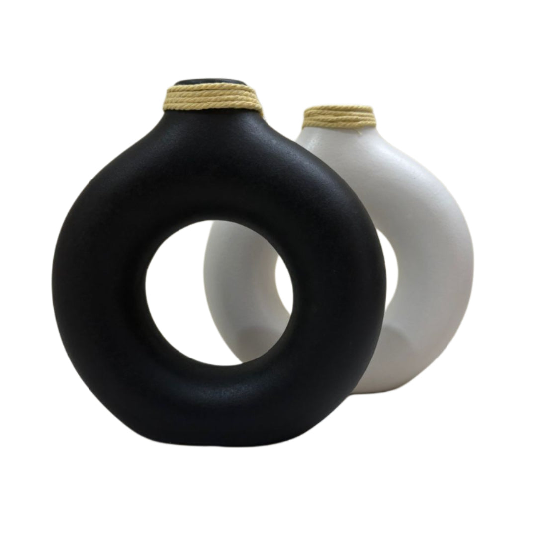Set of 2 Black & White Ceramic Donut Vases – Matte Finish with Yellow Rope Accent