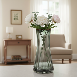 This vase set features a smooth smoky grey glass body with a sleek curved shape and a gold rim finish on the top. The design looks elegant and modern, making it suitable for home décor, office décor, studios, and gifting. These vases can be used for fresh flowers, artificial stems, eucalyptus leaves, or pampas grass. They also look beautiful when placed empty as décor accents.