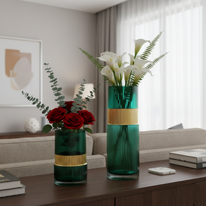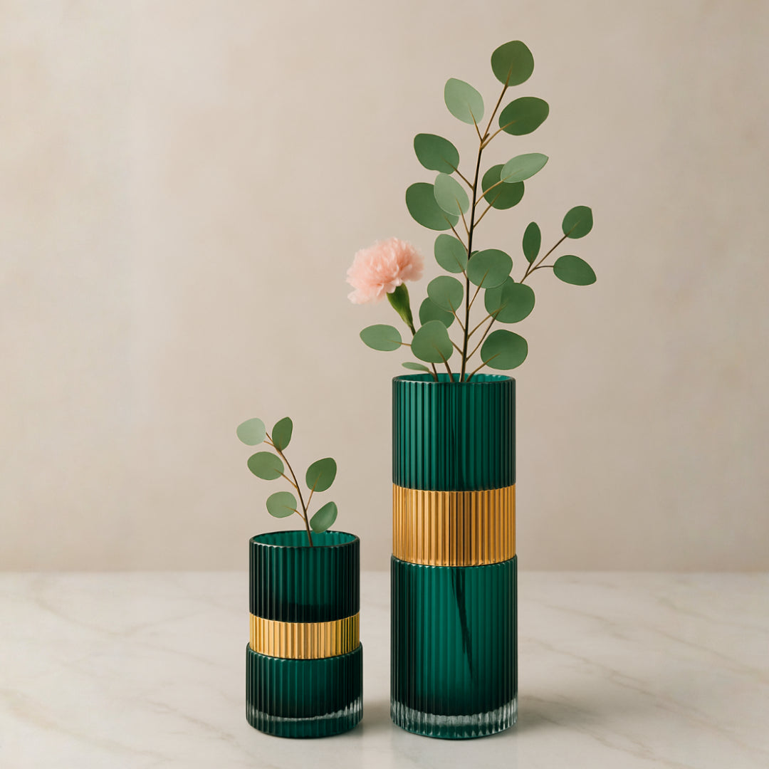 This vase set features a premium turquoise ribbed glass body combined with a striking gold band detail that adds a luxurious and modern touch. The vertical textured pattern enhances the visual height and elegance, making these vases stand out as décor pieces even without flowers. They are perfect for home décor, office décor, restaurants, studios, and high-end gifting.