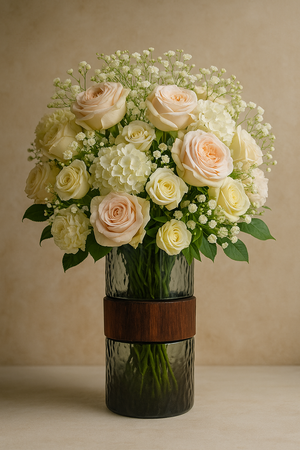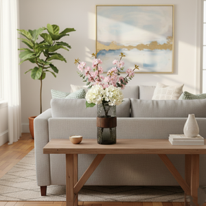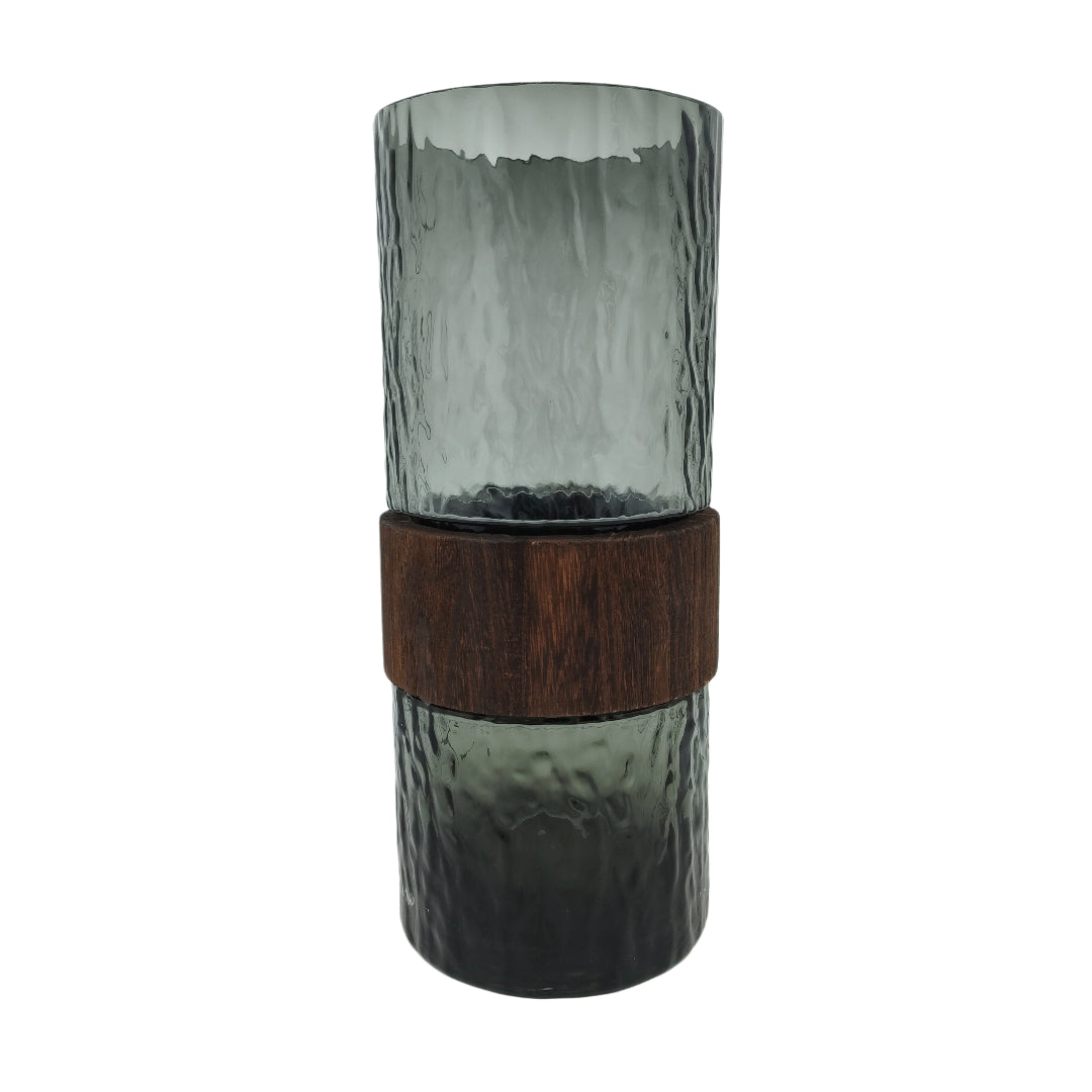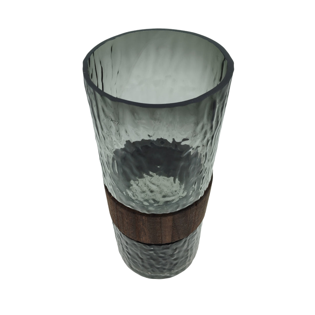 This large decorative vase is made from smoky textured glass and features a natural wooden ring around the centre, giving it a clean, modern look. The hammered glass finish adds depth and character, while the wooden ring provides a warm contrast. Perfect as a statement piece on dining tables, consoles, side tables, shelves, and office décor setups. Works beautifully with fresh flowers, dry flowers, pampas grass, or as a standalone showpiece.