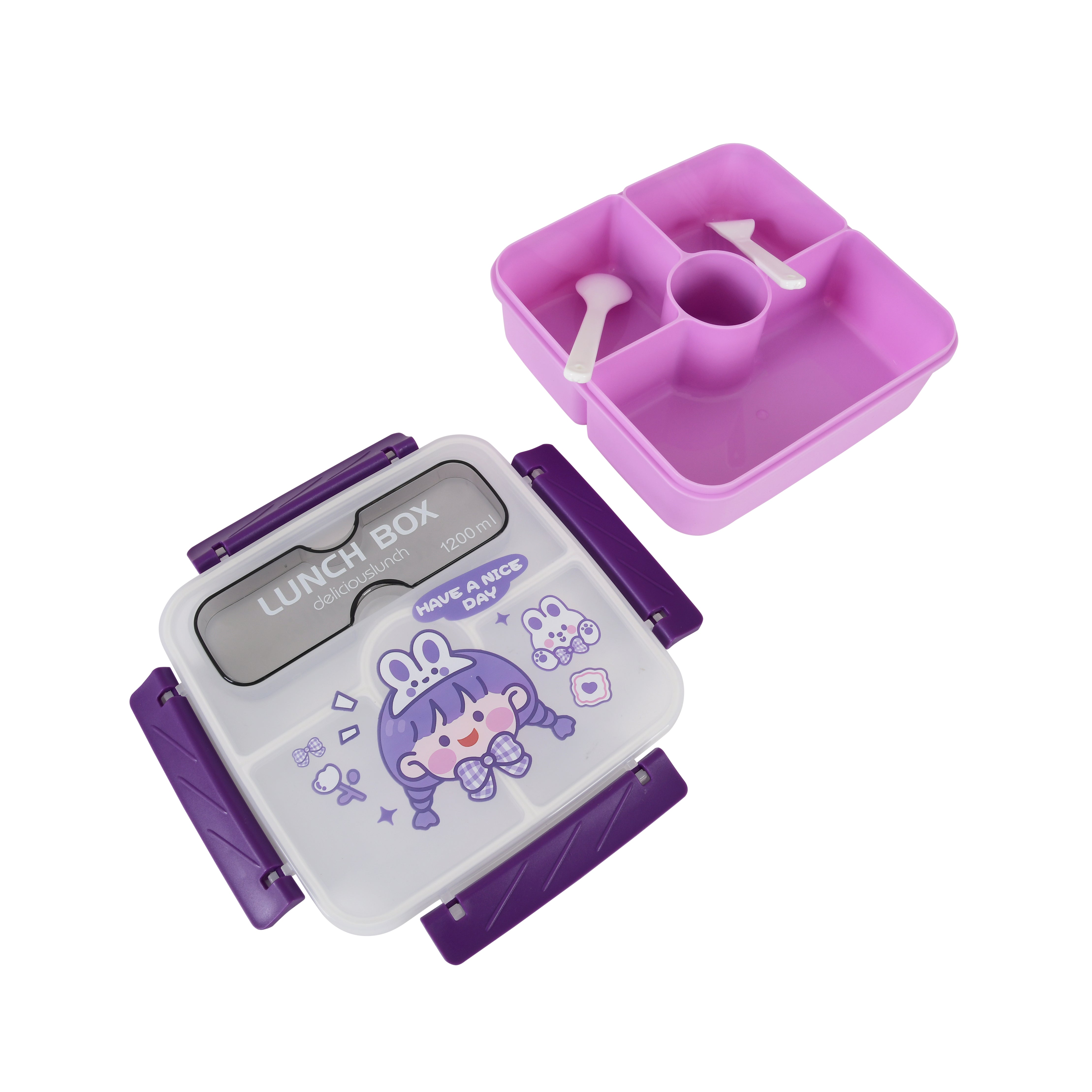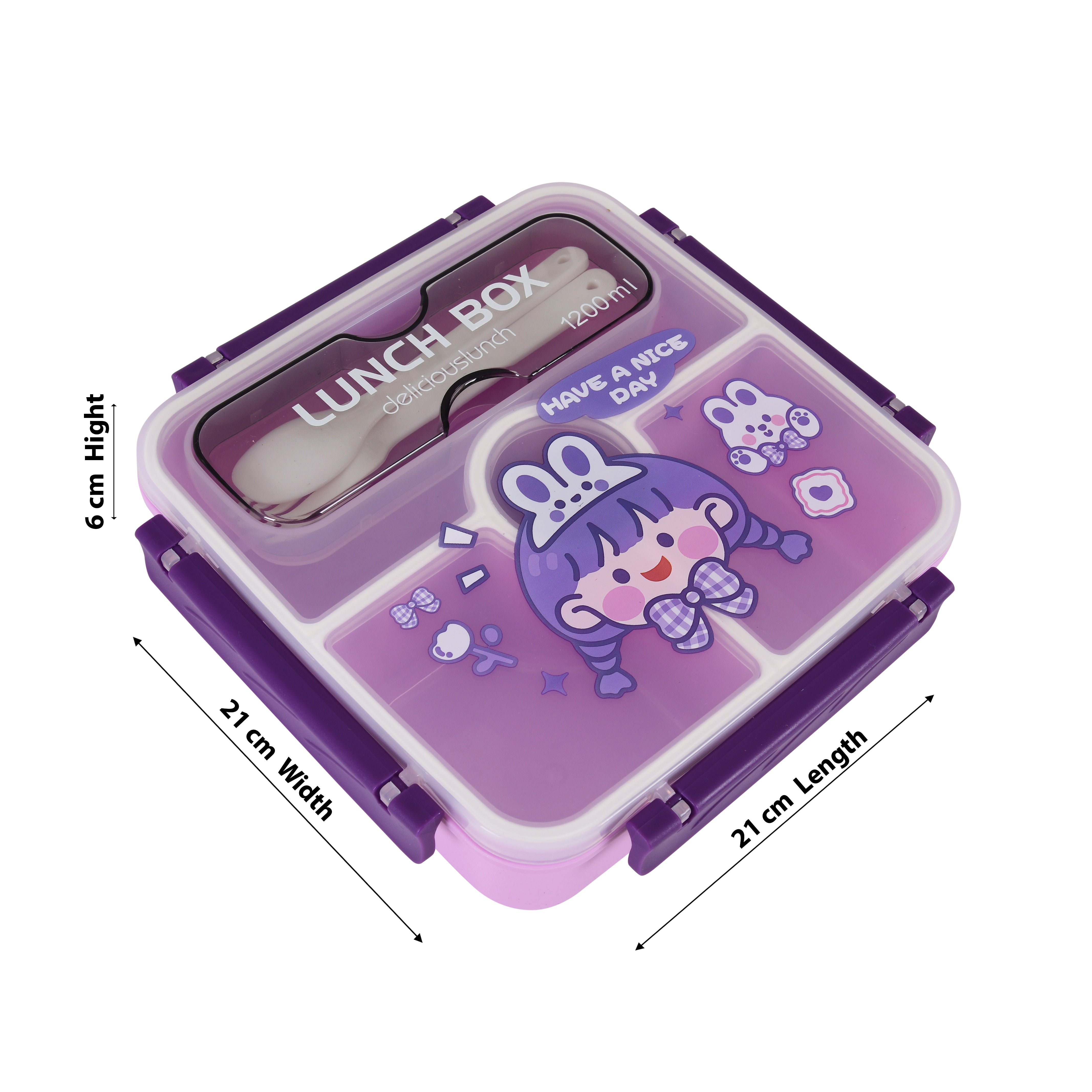 Bring fun and functionality to mealtime with this Square Multi-Compartment Lunch Box – a perfect blend of style, convenience, and durability. Made from BPA-free, food-grade plastic with a hygienic silicone airtight lining, it ensures your meals stay fresh, safe, and spill-free all day. This lunch box is thoughtfully designed with multiple compartments to keep food neatly separated. It also comes with a detachable mini box and a dedicated slot for the included spoon and fork, making it your complete mealtime companion. The playful purple design with a cute girl and bunny print adds a cheerful touch, making it especially appealing for kids while still being practical for office and travel use.