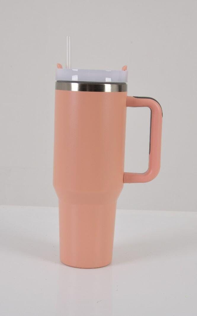The insulated tall mug in a subtle coral pink peachish colour, is the ultimate companion for your daily adventures. Crafted from durable BPA-free PP material with a stylish semi-matte finish and a 304 stainless steel interior, this bottle mug keeps your beverages at the perfect temperature while offering a comfortable grip handle for easy carrying. The innovative leak-proof dual lid mechanism caters to your sipping preferences with one lid for the included reusable straw and another for direct sipping, ensuring mess-free sipping on the go. Its tapered base effortlessly fits into cup holders, making it a travel-friendly choice for work, commuting, or exploring new places. Stay refreshed in style with this versatile insulated bottle.