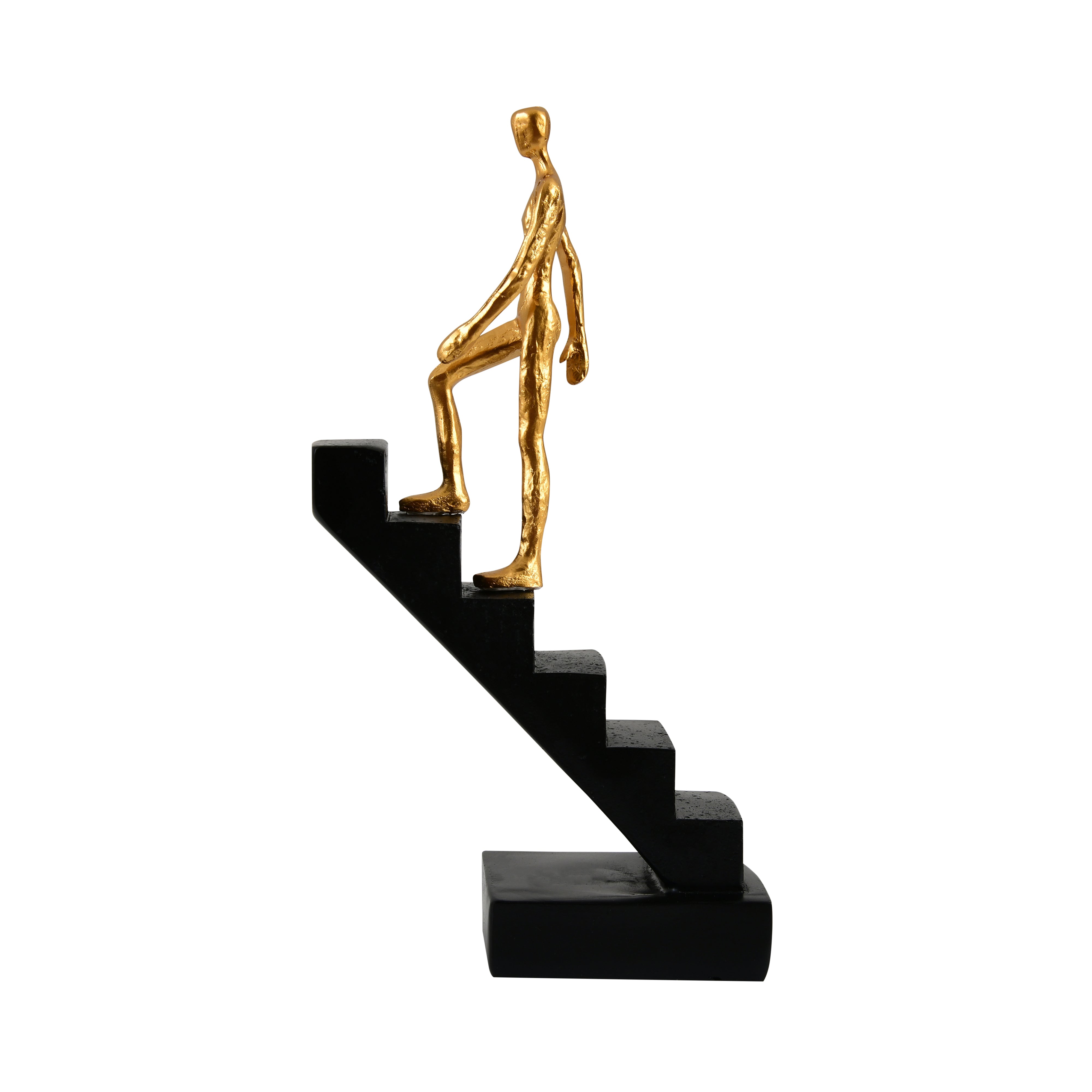 The abstract design emphasizes movement, determination, and upward progress. The golden figure features smooth contours and textured detailing, while the matte black staircase provides a stable and stylish base. Handcrafted finishes ensure each piece is unique and adds a premium feel to the décor. This figurine is lightweight yet sturdy, making it easy to move and display across various indoor locations.