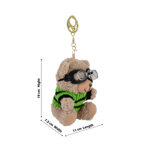 Aviator Teddy Bear Plush Keychain with Goggles & Green Sweater – Cute Bag & Car Charm (55 g, 19 × 11 × 7.5 cm)
